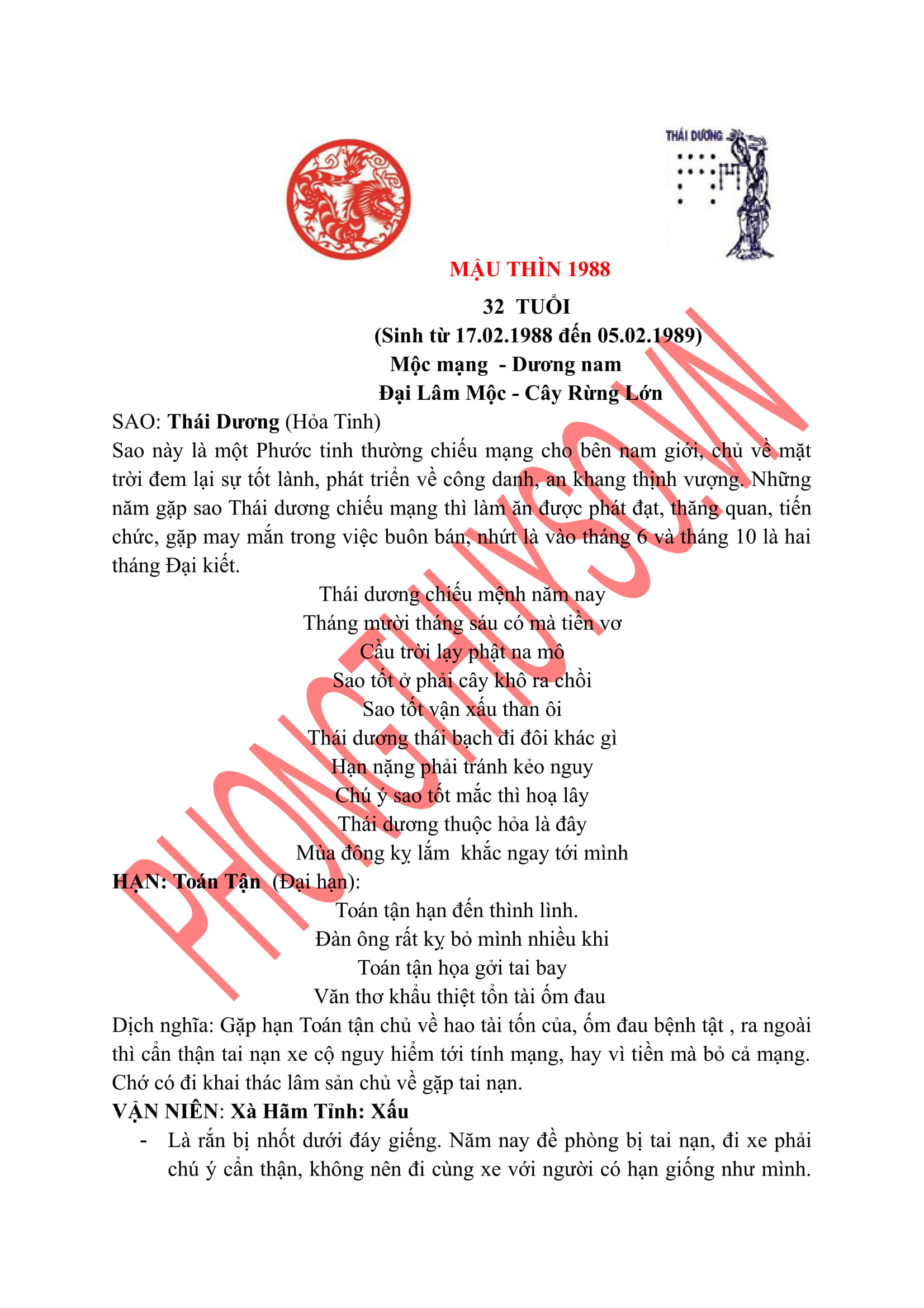Năm 2019 Kỷ Hợi, Mậu Thìn 1988 có sao Thổ Tú chiếu mệnh, do vậy ở trong năm Kỷ Hợi rất có thể bị một vài ốm yếu với sức khỏe.