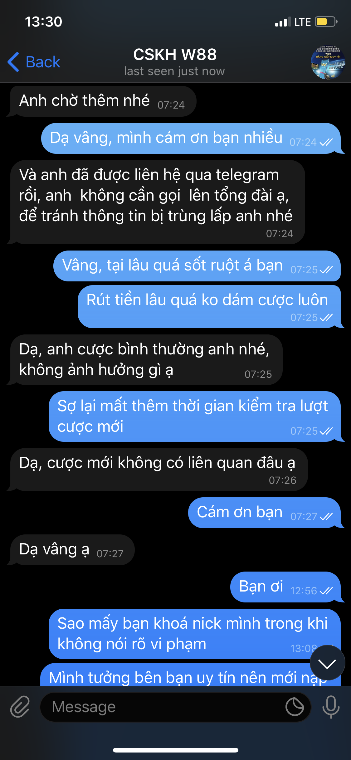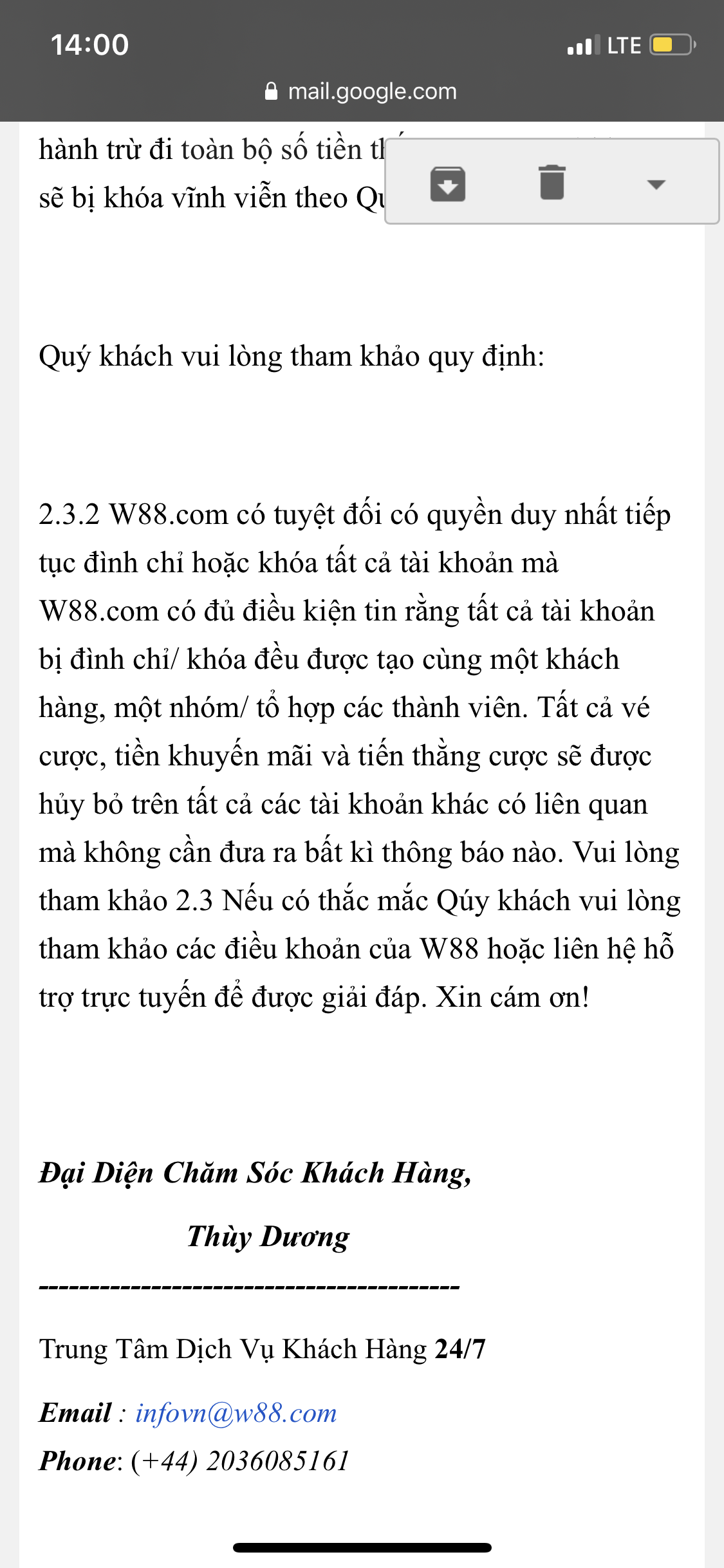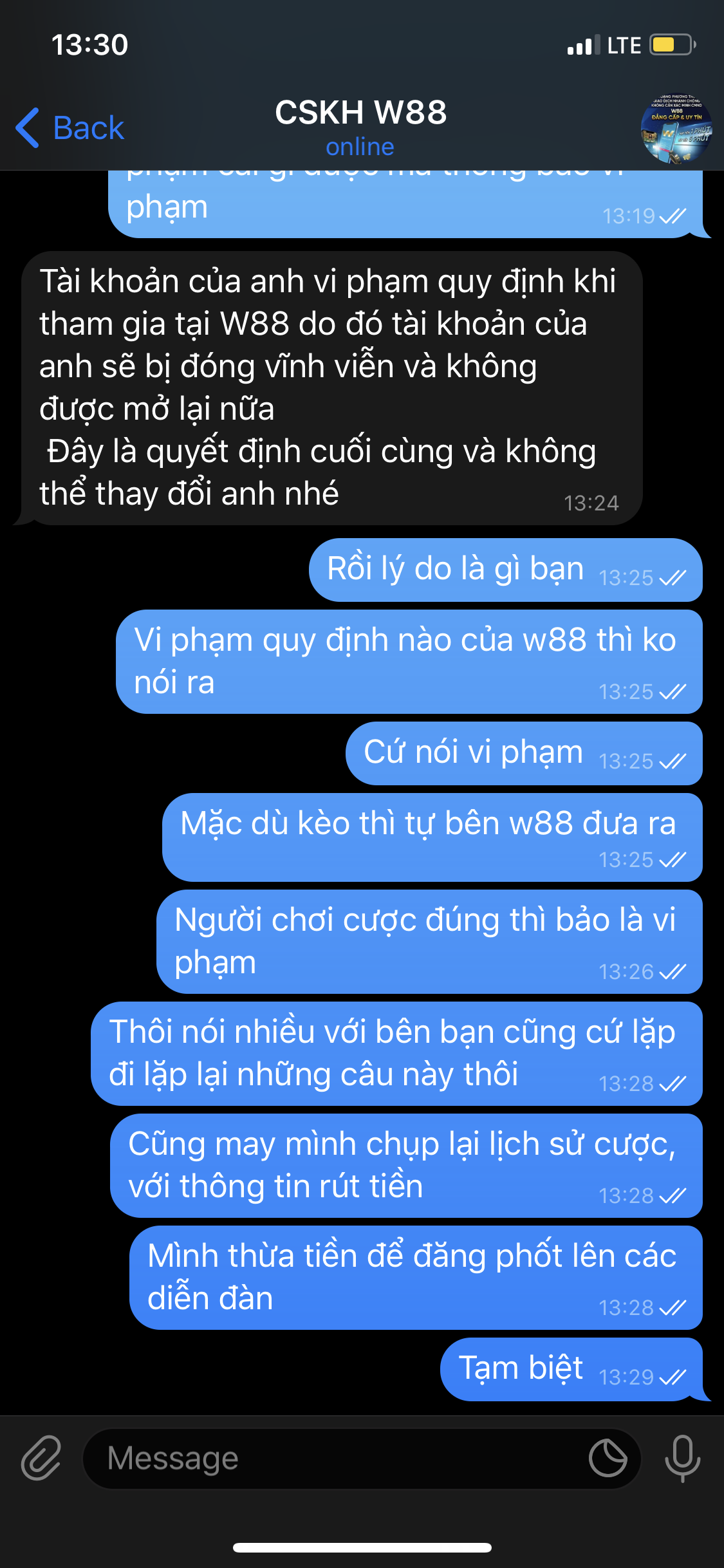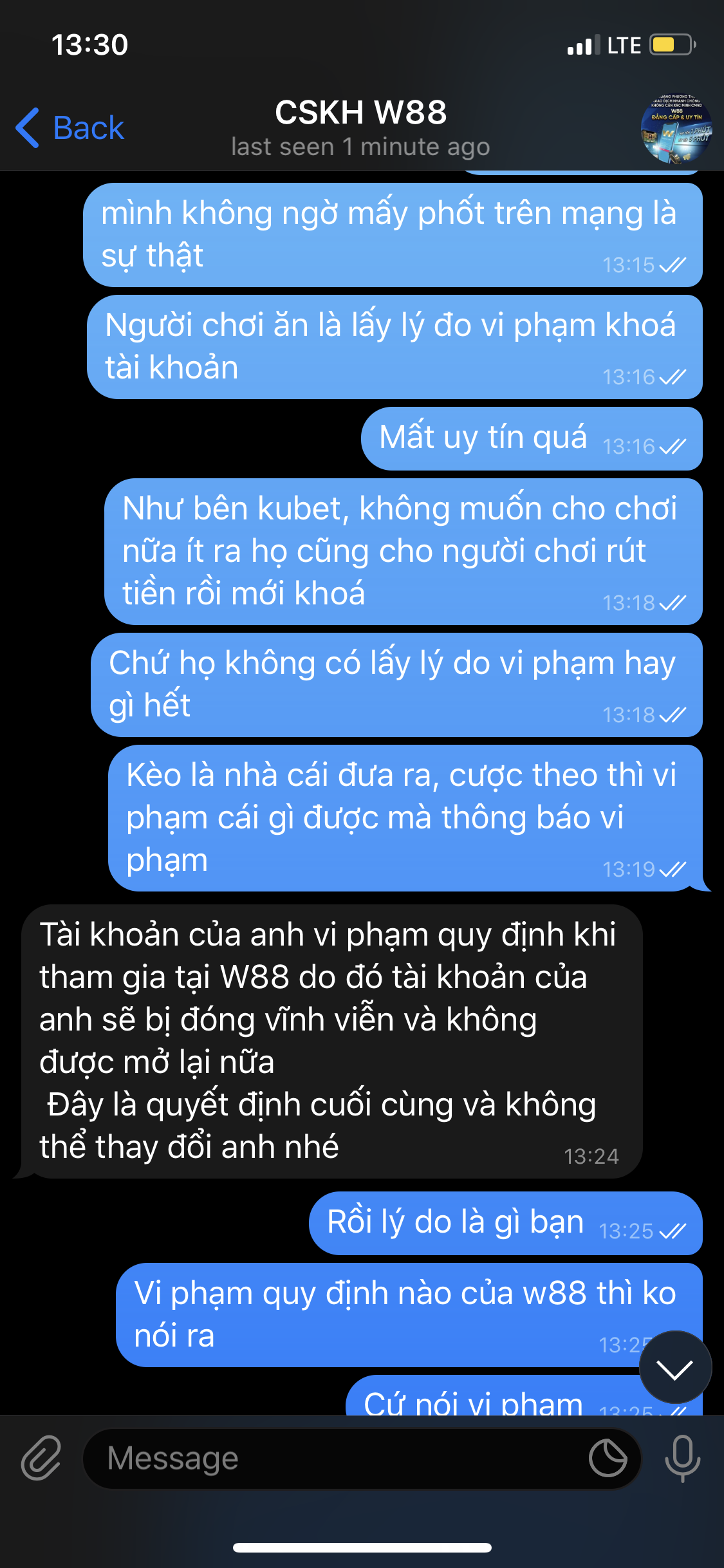 Chuyện là mấy hôm trước, mình cân nhắc lắm nào cuối cùng chọn W88 để nạp tiền vào chơi và hiện tại trong tài khoản đang có 361tr, rút tiền thấy lâu không được duyệt là mình nghi nghi rồi, cứ lâu lâu mình lại phải nhắn support rồi gọi lên tổng đài, bên đó cứ phải đợi xác minh xem có gian lận hay vi phạm quy định gì không nó mới cho rút, mình thì chỉ cược thể thao thôi, kèo là nhà cái đưa ra, vi phạm thế nào được, mình cũng không nhận khuyến mãi để khỏi vướng mắc khi rút tiền, thế mà cuối cùng bên w88 khoá tài khoản rồi gửi mail báo do mình tạo nhiều tài khoản, lấy lý do cũng khôn ghê, cược bóng đá không ăn khuyến mãi thì tạo nhiều tài khoản để làm cái gì, liên hệ hỗ trợ thì trả lời như cái máy, copy rồi dán sẵn như văn mẫu, mọi người ai biết mấy diễn đàn cá độ nào đăng phốt không gửi lên mình đăng thêm cho mấy ae cá độ cạch nó ra