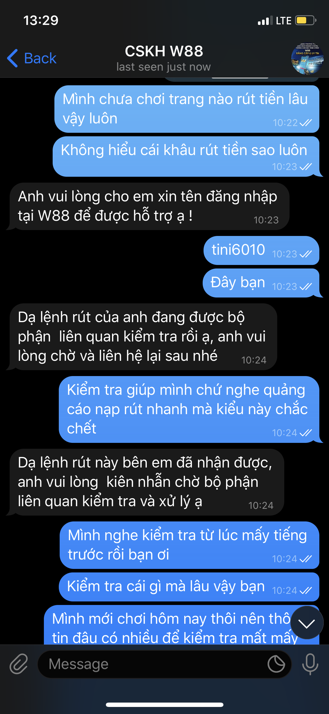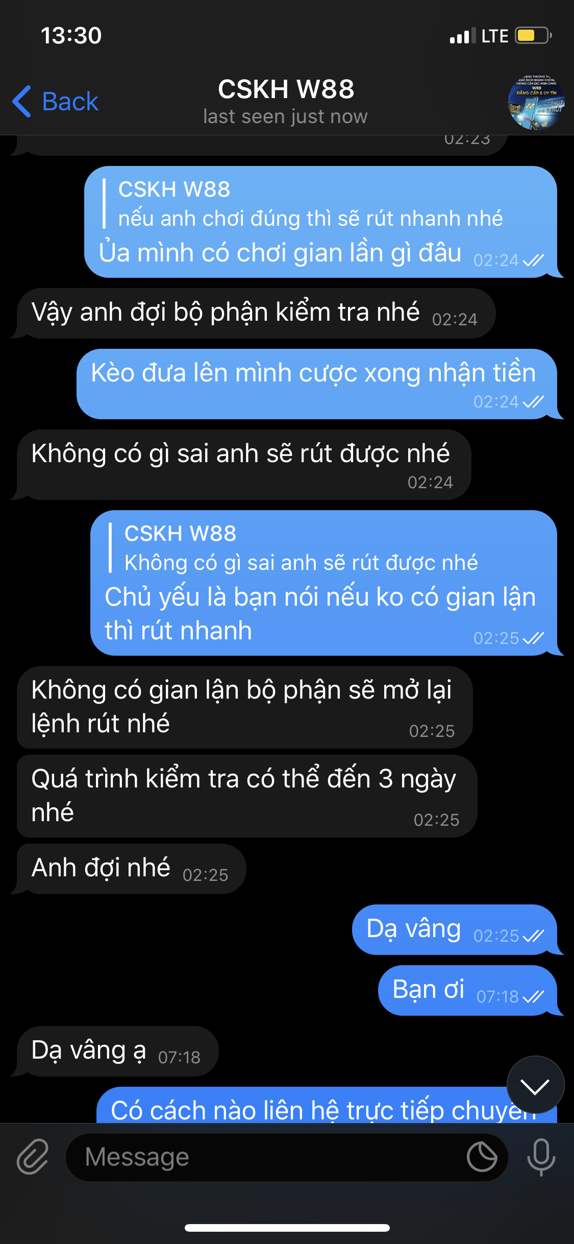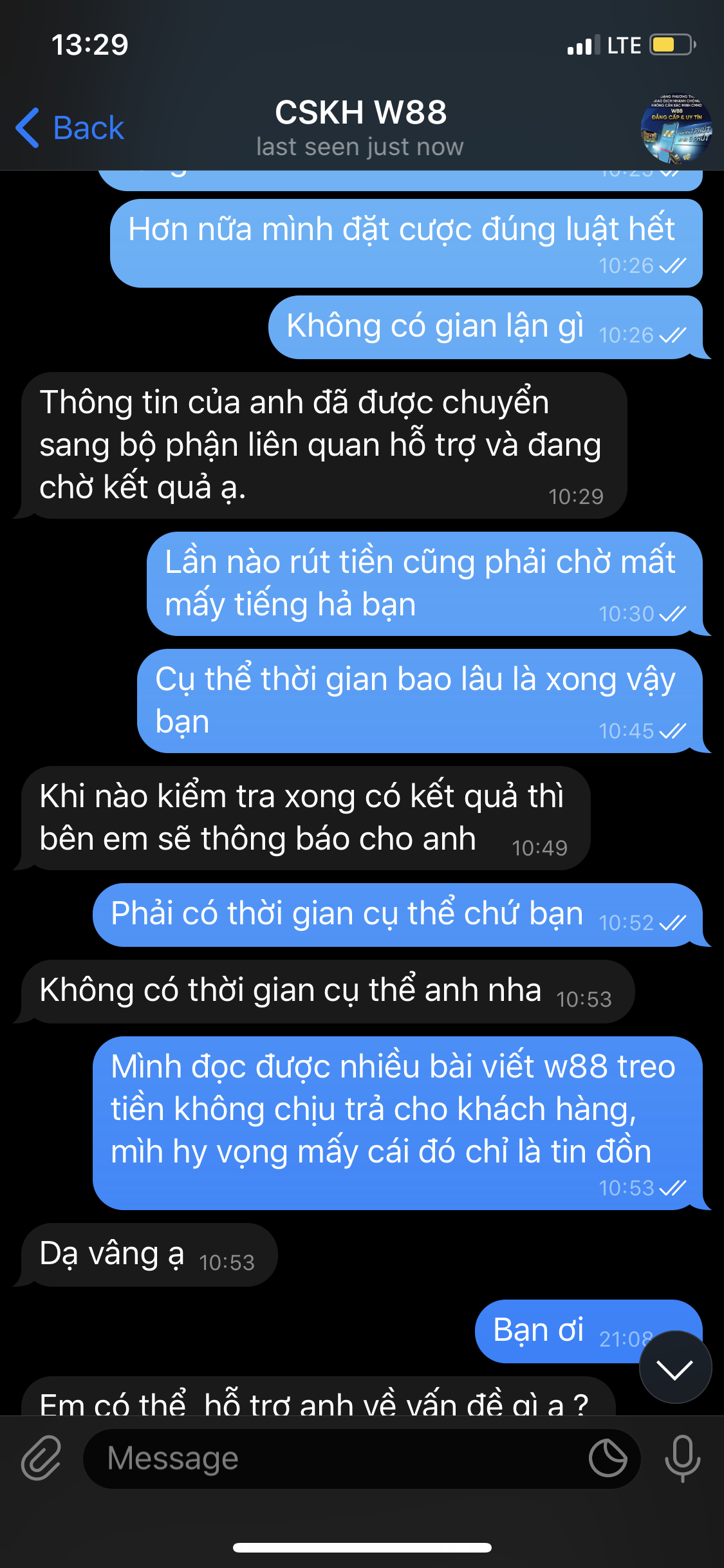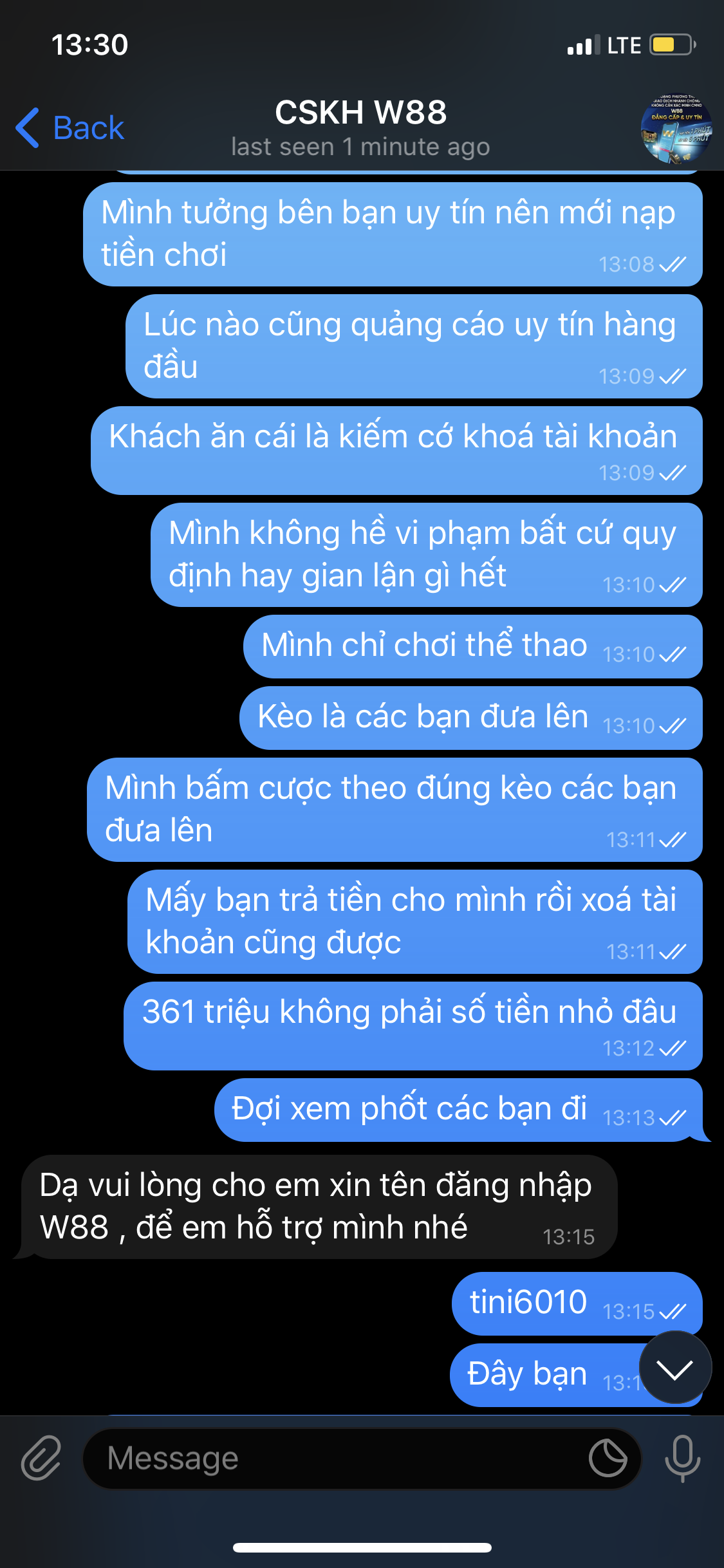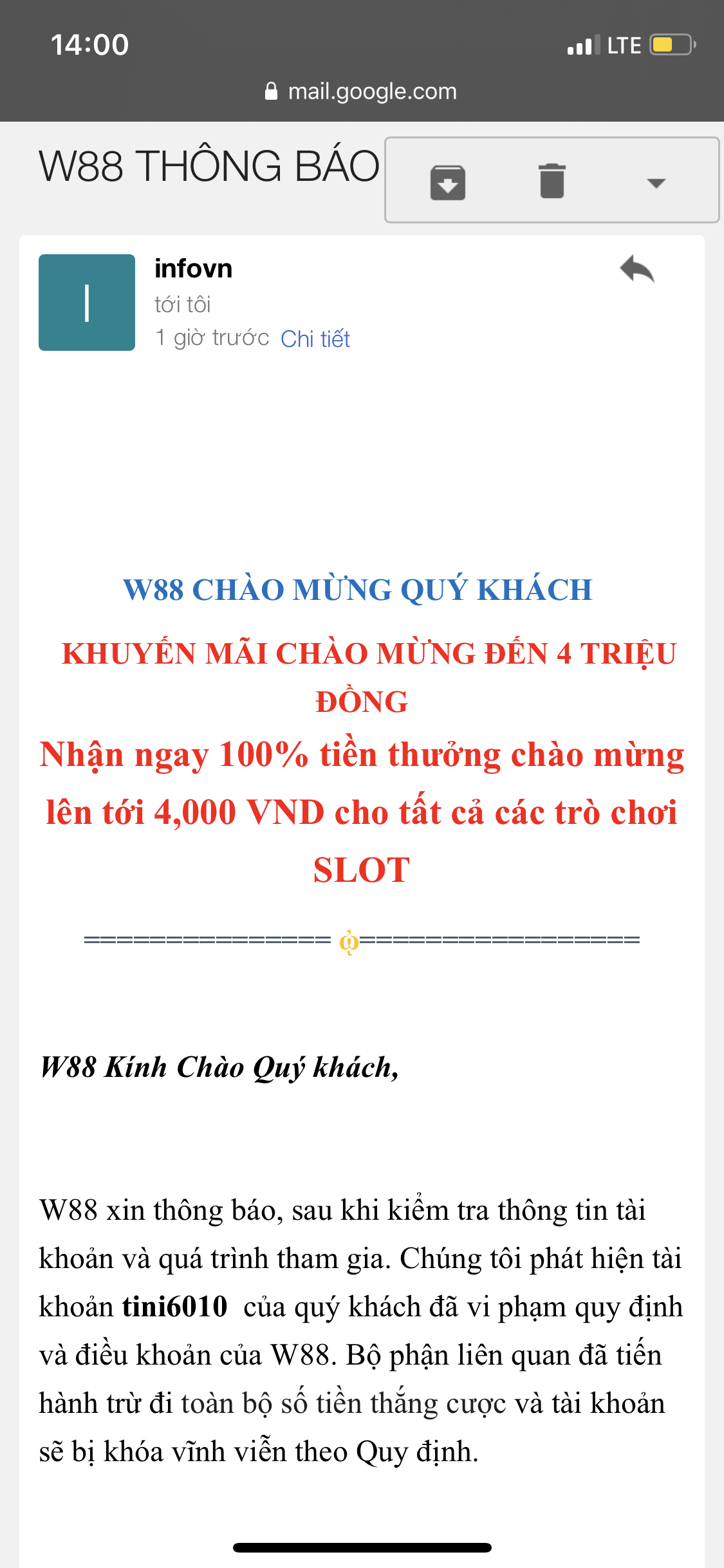 Chuyện là mấy hôm trước, mình cân nhắc lắm nào cuối cùng chọn W88 để nạp tiền vào chơi và hiện tại trong tài khoản đang có 361tr, rút tiền thấy lâu không được duyệt là mình nghi nghi rồi, cứ lâu lâu mình lại phải nhắn support rồi gọi lên tổng đài, bên đó cứ phải đợi xác minh xem có gian lận hay vi phạm quy định gì không nó mới cho rút, mình thì chỉ cược thể thao thôi, kèo là nhà cái đưa ra, vi phạm thế nào được, mình cũng không nhận khuyến mãi để khỏi vướng mắc khi rút tiền, thế mà cuối cùng bên w88 khoá tài khoản rồi gửi mail báo do mình tạo nhiều tài khoản, lấy lý do cũng khôn ghê, cược bóng đá không ăn khuyến mãi thì tạo nhiều tài khoản để làm cái gì, liên hệ hỗ trợ thì trả lời như cái máy, copy rồi dán sẵn như văn mẫu, mọi người ai biết mấy diễn đàn cá độ nào đăng phốt không gửi lên mình đăng thêm cho mấy ae cá độ cạch nó ra
