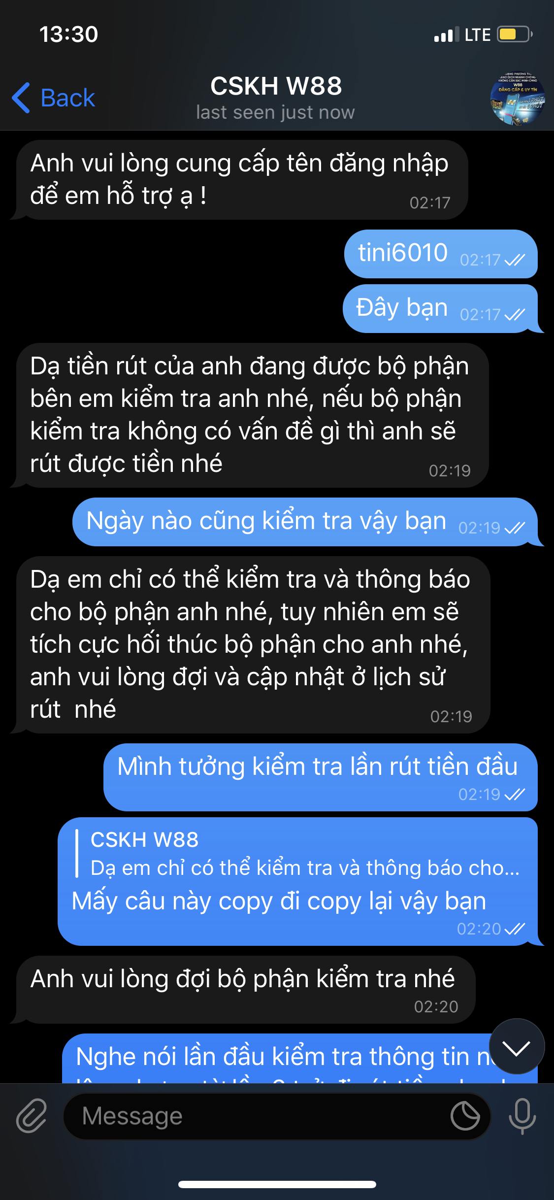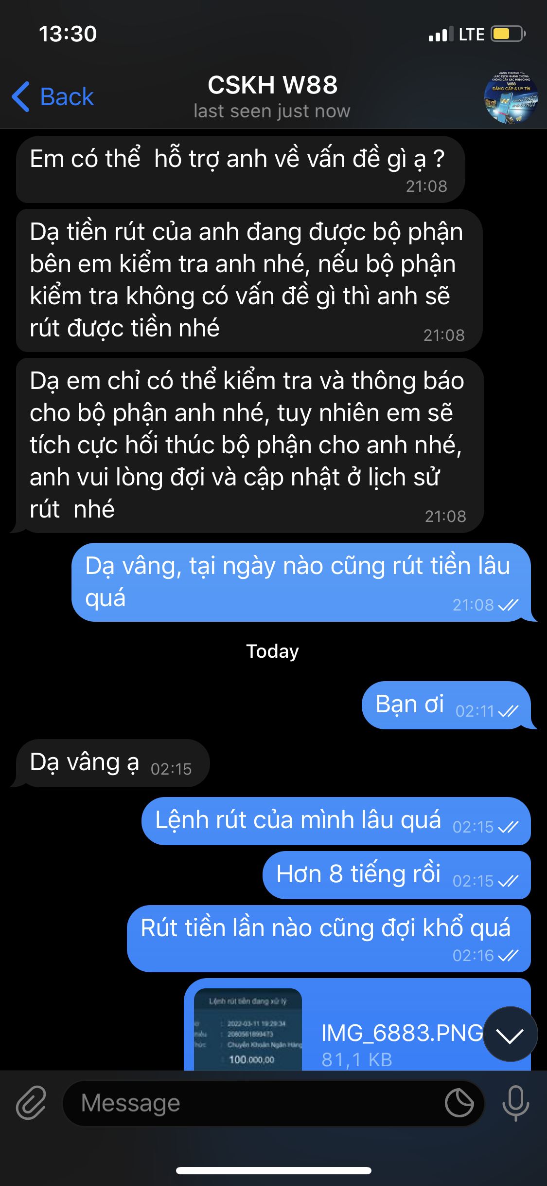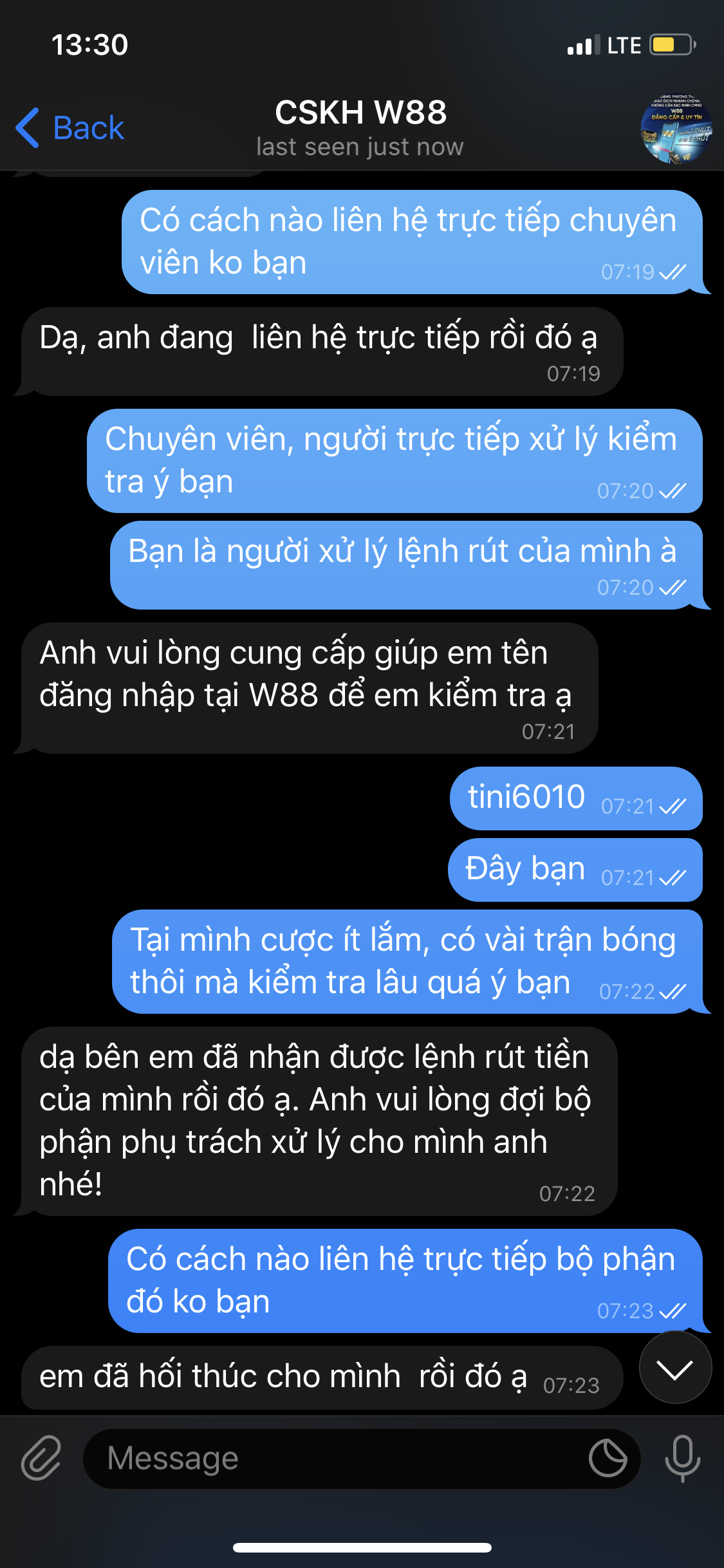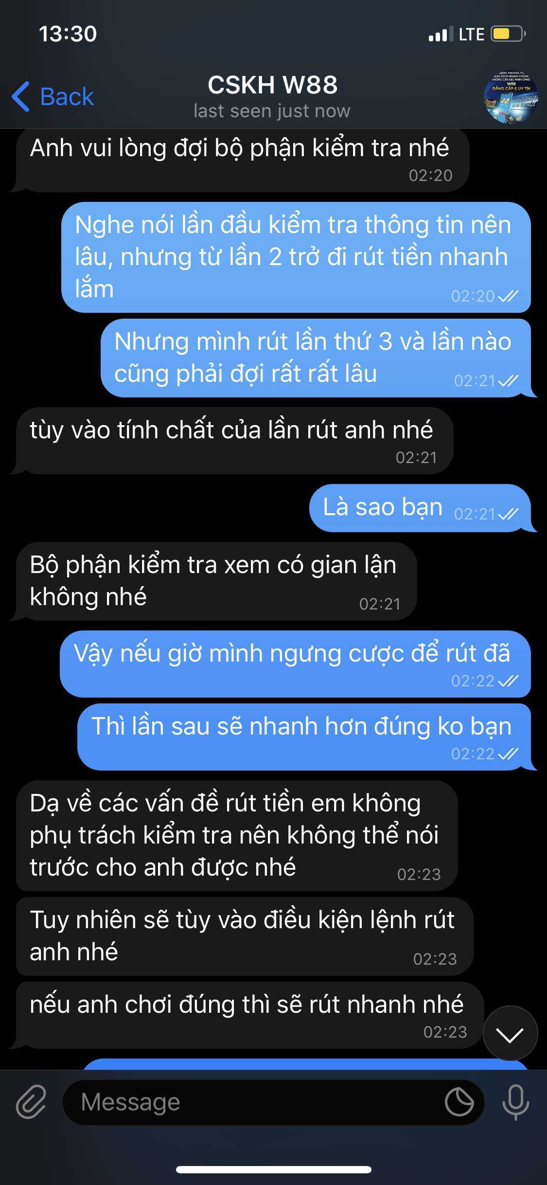 Chuyện là mấy hôm trước, mình cân nhắc lắm nào cuối cùng chọn W88 để nạp tiền vào chơi và hiện tại trong tài khoản đang có 361tr, rút tiền thấy lâu không được duyệt là mình nghi nghi rồi, cứ lâu lâu mình lại phải nhắn support rồi gọi lên tổng đài, bên đó cứ phải đợi xác minh xem có gian lận hay vi phạm quy định gì không nó mới cho rút, mình thì chỉ cược thể thao thôi, kèo là nhà cái đưa ra, vi phạm thế nào được, mình cũng không nhận khuyến mãi để khỏi vướng mắc khi rút tiền, thế mà cuối cùng bên w88 khoá tài khoản rồi gửi mail báo do mình tạo nhiều tài khoản, lấy lý do cũng khôn ghê, cược bóng đá không ăn khuyến mãi thì tạo nhiều tài khoản để làm cái gì, liên hệ hỗ trợ thì trả lời như cái máy, copy rồi dán sẵn như văn mẫu, mọi người ai biết mấy diễn đàn cá độ nào đăng phốt không gửi lên mình đăng thêm cho mấy ae cá độ cạch nó ra