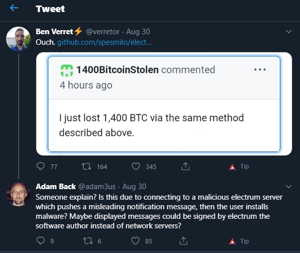 Adam Back - CEO BLockstream nói là anh chàng này có thể đã kết nối đến một máy chủ không an toàn, và vì thế bọn tội phạm có thể đã gửi thông báo update ví để trộm tiền.