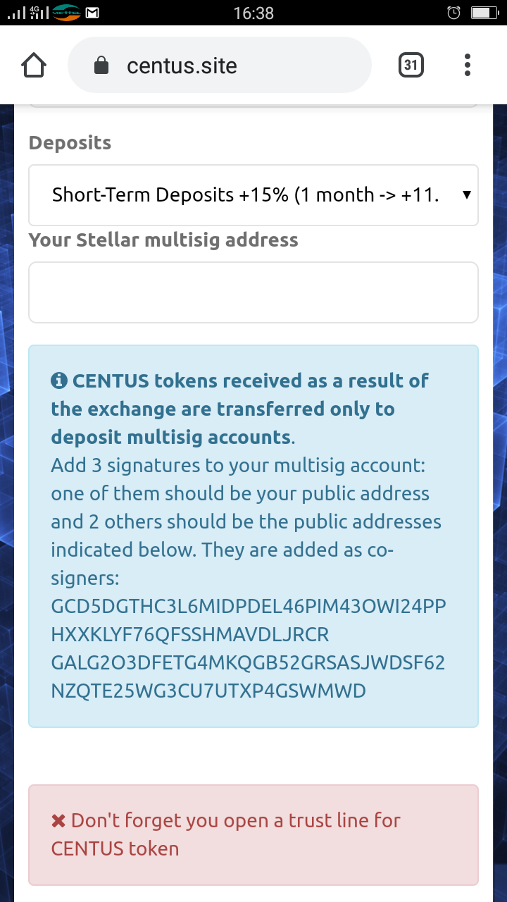 Tại trang centus.site, ngay sau khi bác tạo lệnh exchange bonus sang centus, trang web chuyển sang giao diện để bác điền địa chỉ multisig và kèm theo đó là đoạn hướng dẫn, bác xem nhé!