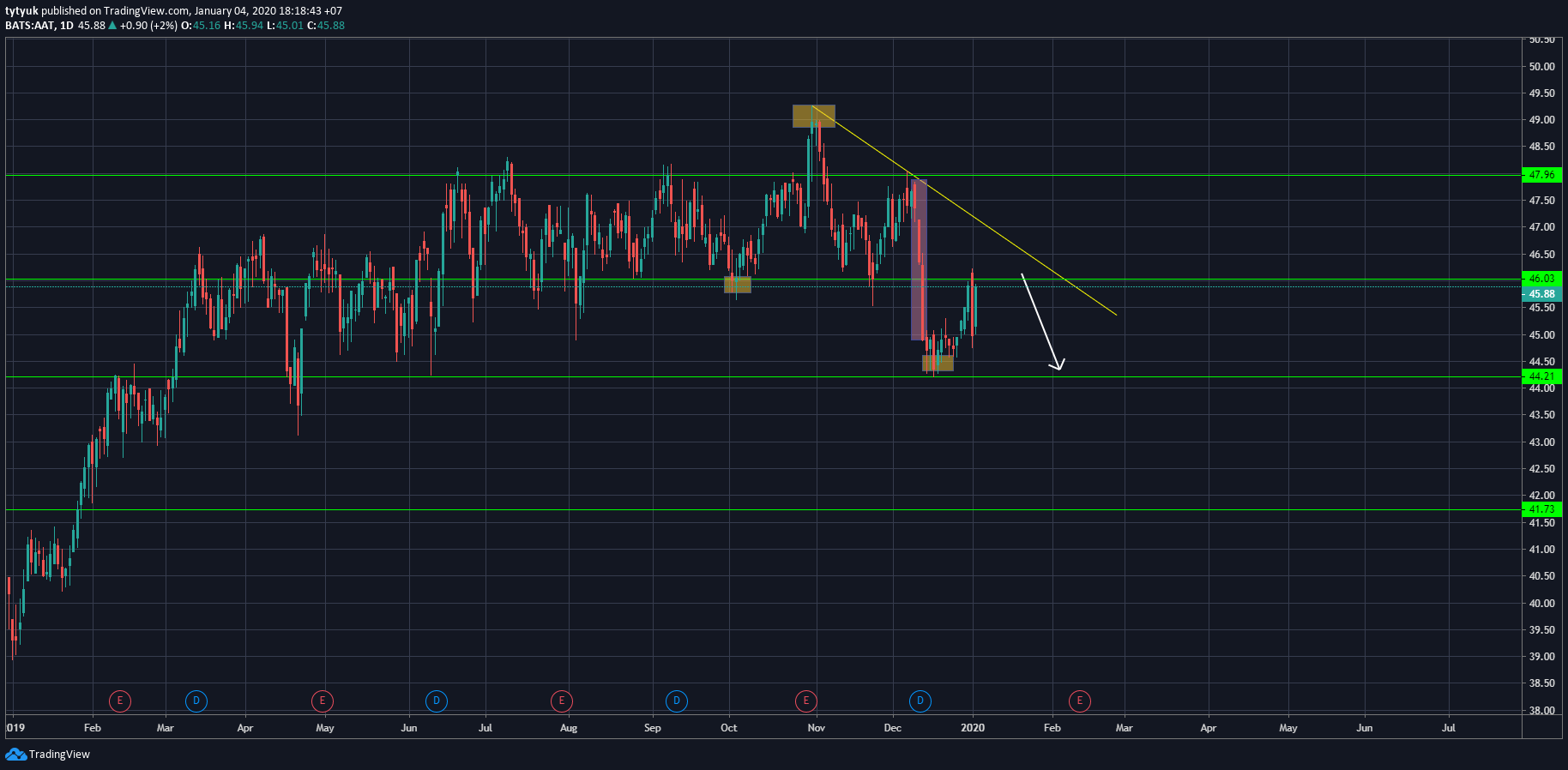 Mô hình tăng trước đó đã bị phá vỡ bằng 3 cây nến giảm giá mạnh,phá qua đáy dẫn đến đỉnh cao nhất của xu hướng tăng trước đó, chúng ta sẽ canh bán xuống khi giá tiếp cận đường trendline màu vàng tại vùng giá 46.8 hoặc bán luôn giá này vì nó đang chạm vùng hỗ trợ giờ là kháng cự, SL trên vùng kháng cự 48