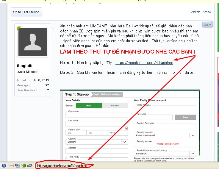 Xin chào anh em MMO4ME .như hứa Sau worldcup tôi sẽ giới thiệu các bạn cách nhận 30 lượt spin miễn phí và sau khi chơi win được bao nhiêu thì anh em có thể rút được tiền ngay . Mà không phải thằng tiền bonus hay bị yêu cầu gì cả . Ngoài việc account của anh em phải được verified . Thủ tục verified như những site khác đơn giản . Bắt đầu nào :