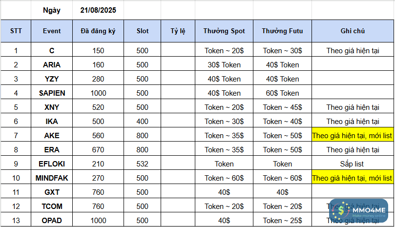 -Sự kiện ẩn: Cơn sốt giới thiệu WLFI (15$); Thử thách token hot (10$); Nhiệm vụ Alpha mùa 1 (30$); Bữa tiệc SAFE4 (20$); Bữa tiệc ATN; Bữa tiệc WINR (~10$); Bữa tiệc KINTO (~20$); Bữa tiệc B (~20$); Bữa tiệc LINK (20$); Nạp fiat (15$); Lễ hội IP (30$).