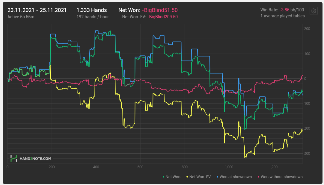 Hôm nay em mới đánh chút mà thua 2 buy-in luôn rồi, thua âm luôn phần thắng của hôm qua, đường EV vàng thảm hại đâm thẳng xuống dưới luôn.