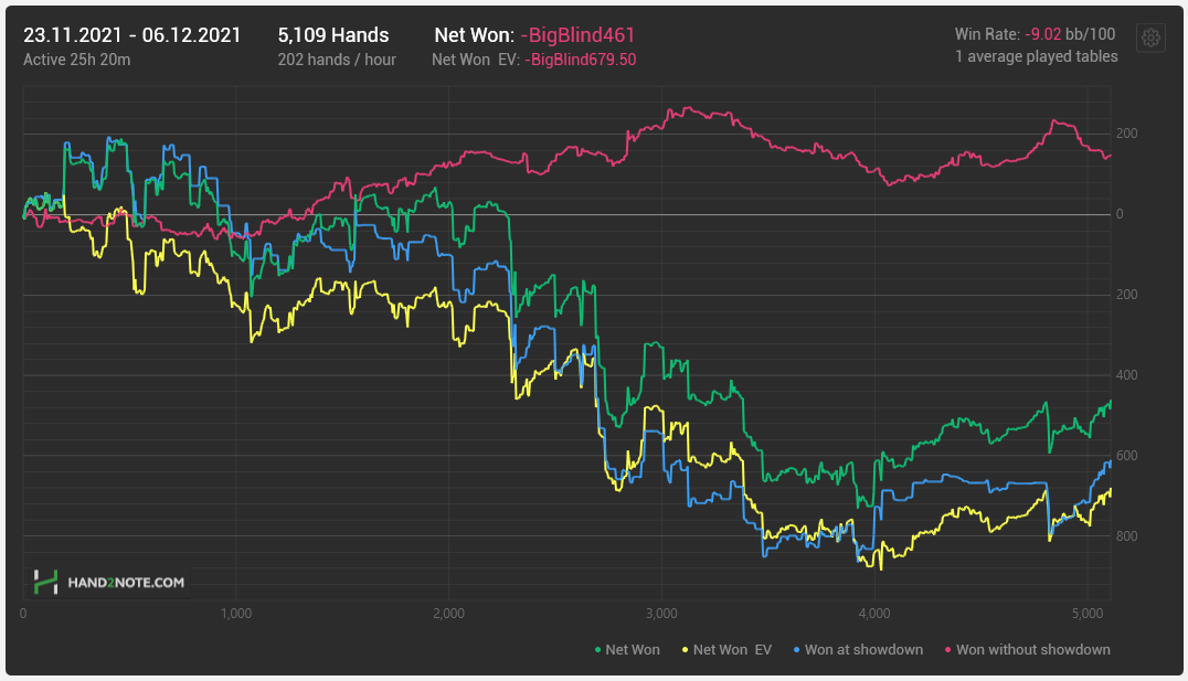 Luyện tập đã có 1 ít kết quả, không còn all-in ngu nữa nên không bị những cú giảm 100bb như những ngày trước, nhịn đau fold nhiều hơn, bluff đủ không quá nhiều.