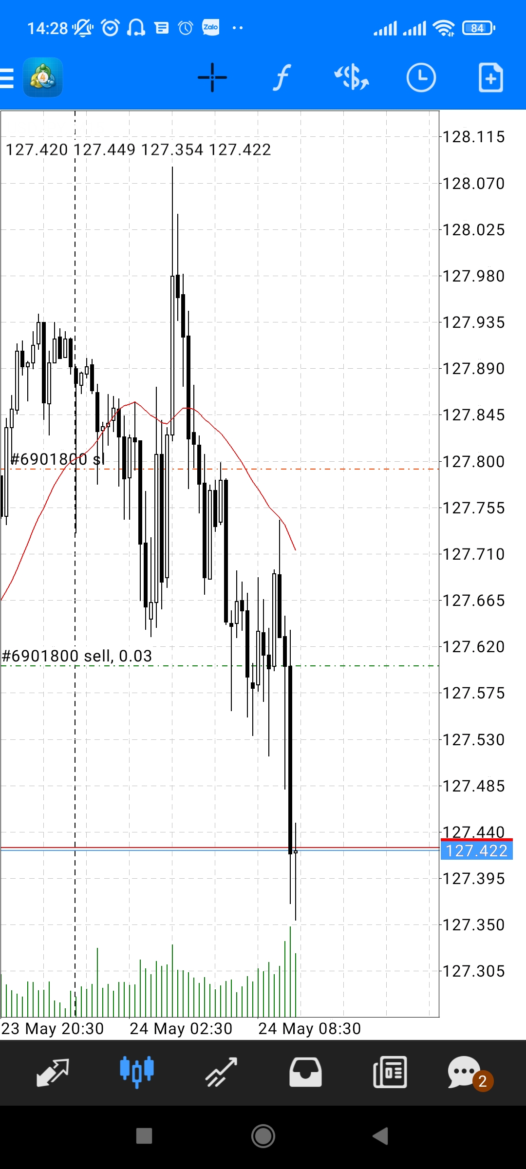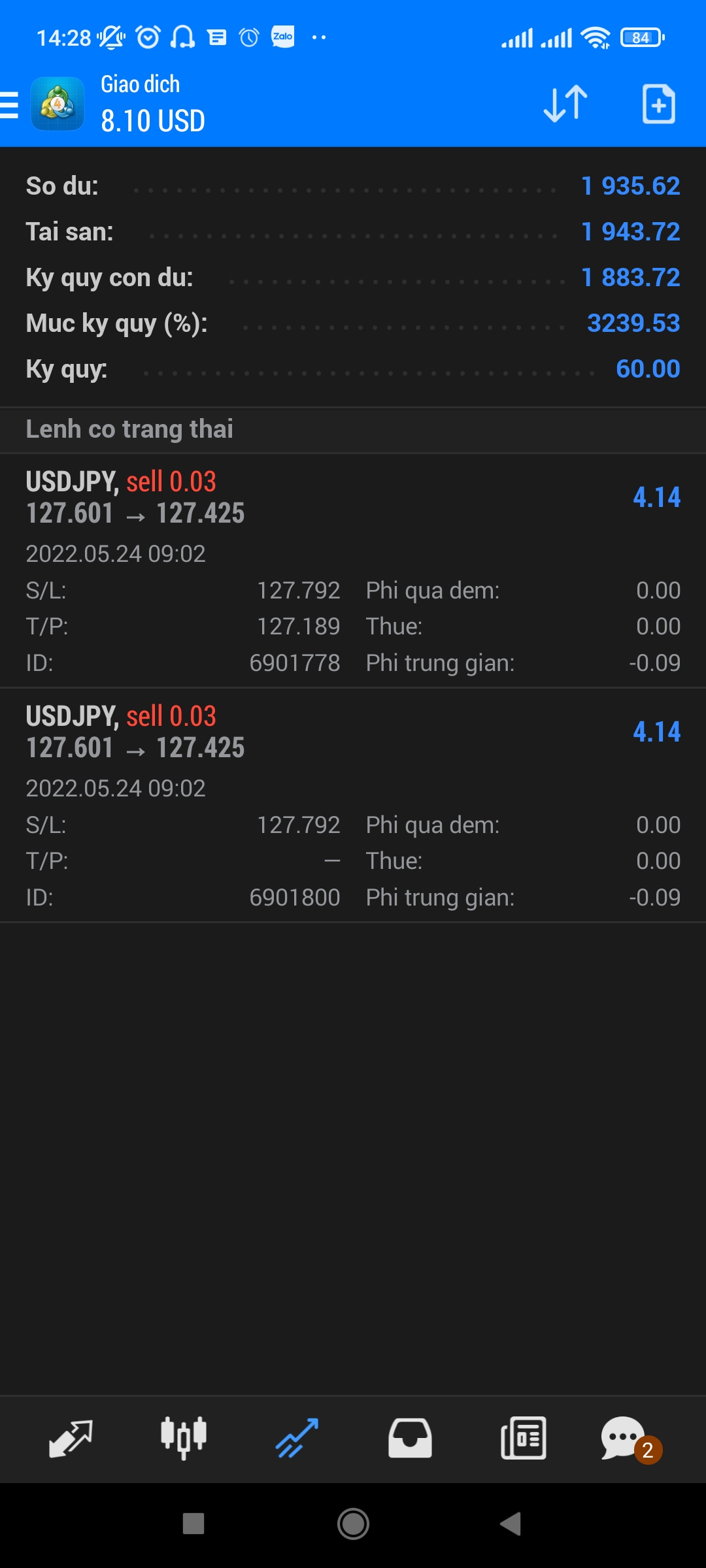 Lệnh 2 cũng đã stoploss rồi ạ.Lệnh 1 đã cắn profit. Để lệnh 2 chạy tiếp các bác ạ.