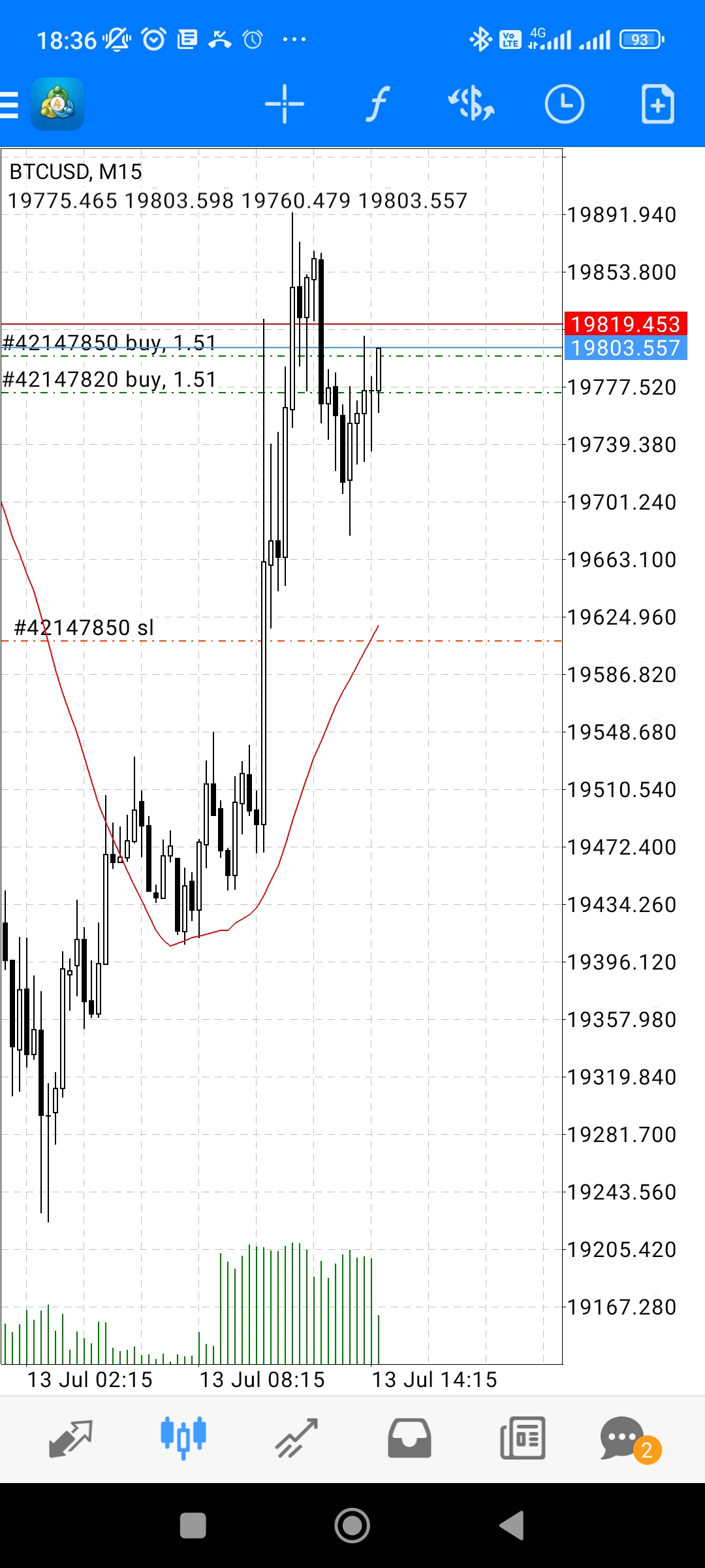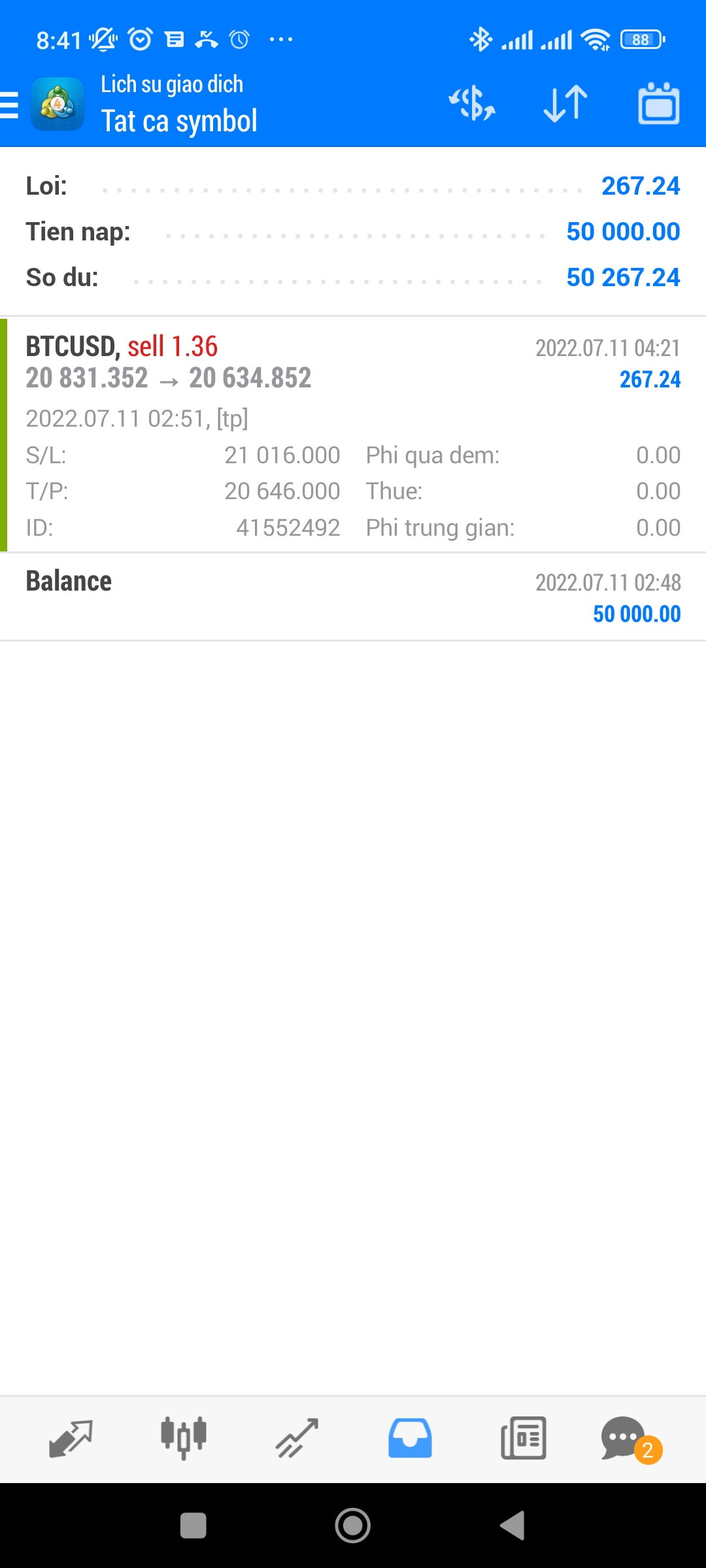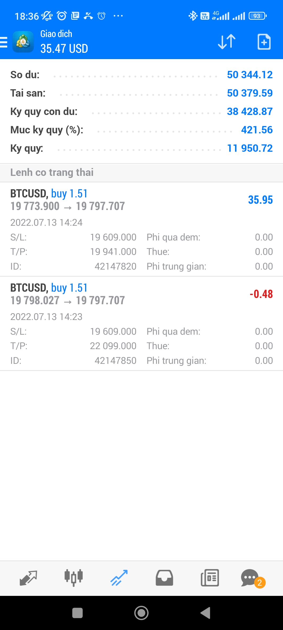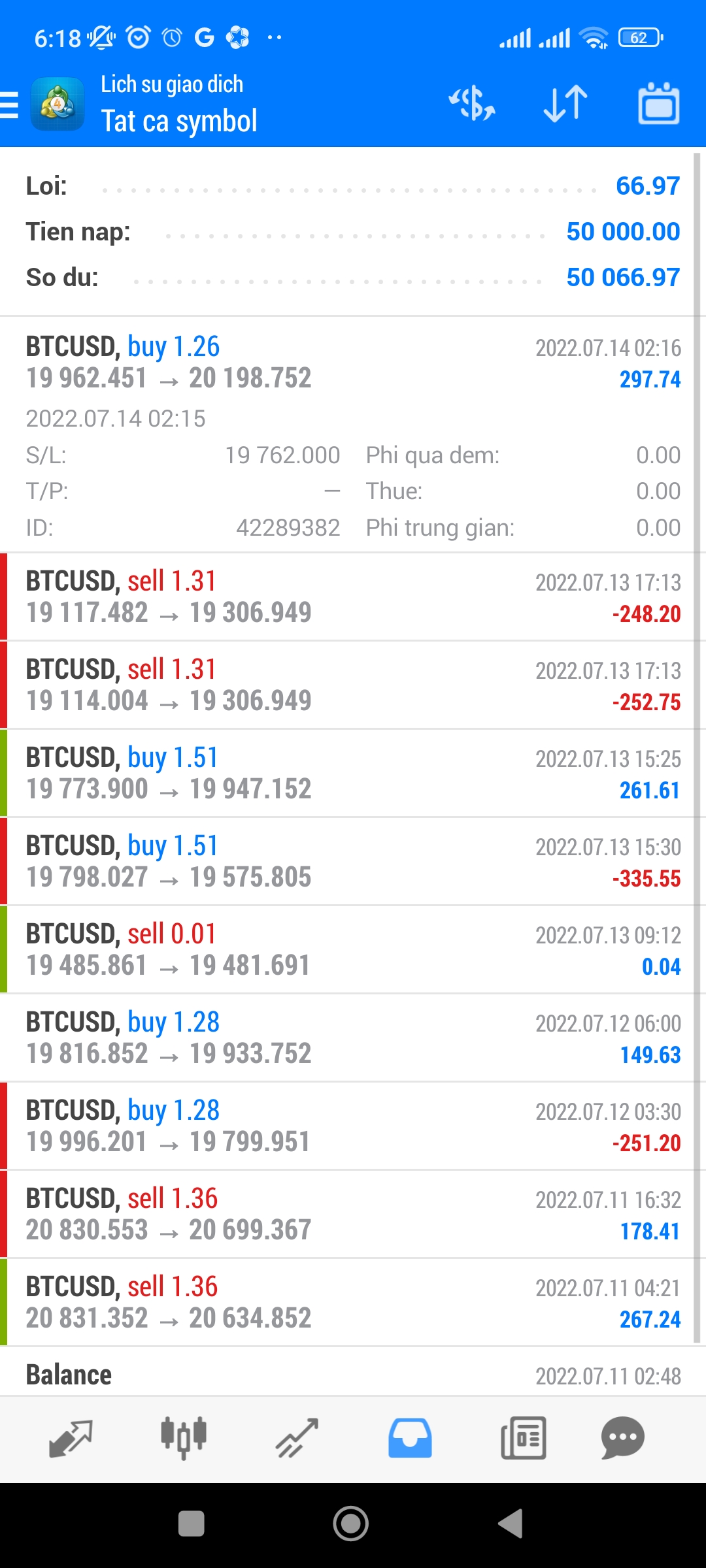 Đây là tài khoản e chạy BOT trên cả 2 cặp XAU và BTC vào lệnh theo tín hiệu EMA 34,89 cắt nhau giống bác chủ thớt nhưng điểm SL được tính theo max/min của 10 nến trước đó còn TP thả nổi (Trailing), SL mỗi lệnh là 1% vốn.