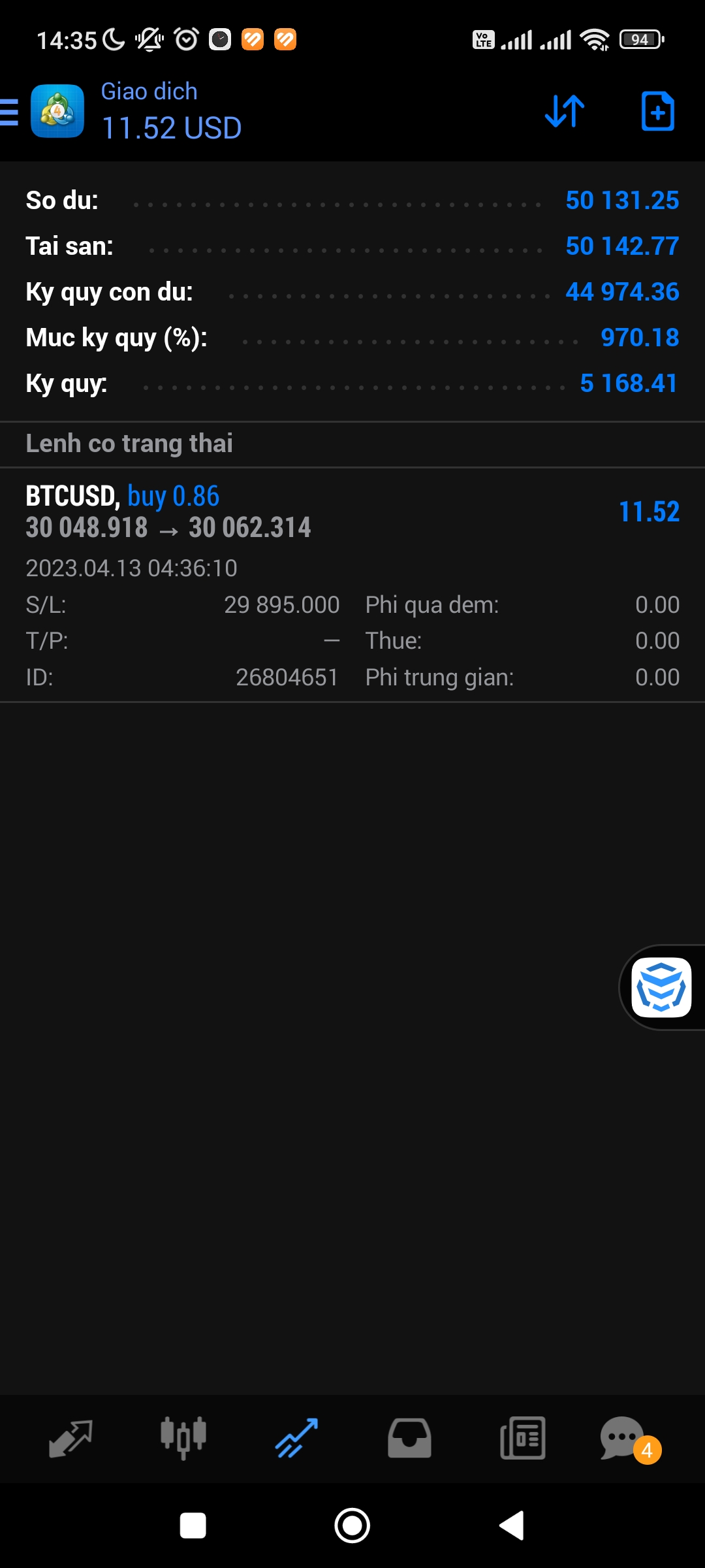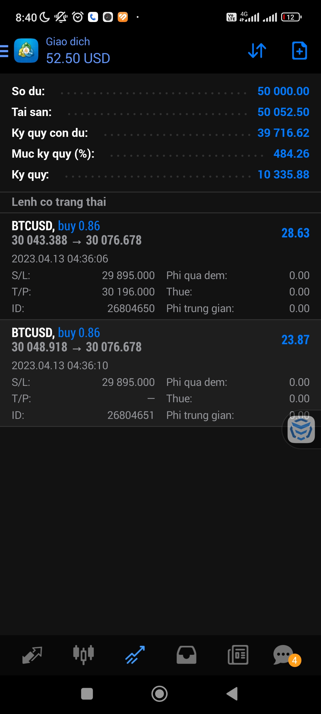 Thi quỹ thì 50/50 mà bác nên phải đi lot to mới pass được, cầm live thì phải đi vốn 2% x 12% x (Số vốn cầm live), nên với vốn 10k đi tầm 0,05-0,06 là max, nên mình mới nói chủ thớt thi quỹ chi cho mắc công tốn tiền, đánh kiểu đó cầm live tầm 10 ngày đến nửa tháng là cháy rụi rồi, bằng chứng là bác thớt cầm live rất nhiều lần nhưng không lần nào rút tiền lần đầu tiên được, mình nói để bác thớt rút kinh nghiệm, mình đã từng trải qua giai đoạn này và rút được kinh nghiệm, phương pháp đánh của chủ thớt mình không bàn đến nhưng phương pháp quản lý vốn tư duy sai hoàn toàn, bác chủ thớt nếu cần thì liên hệ với mình chỉ cho công thức quản lý vốn khi pass quỹBác ấy cũng live 10k thôi mà bác. có cái mình thấy về sau bác ấy đi lot to quá. 10k, tính ra được 1k2 vốn, chắc với mình vào tổng số lệnh 0,1 lot là hết cỡ. Thế nên chả lần nào mình pass quỹ được. Giờ bỏ thi quỹ bác ạ. Không đủ năng lực pass quỹ