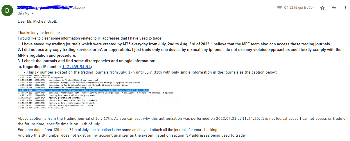 Vậy thì nhiều khả năng mình bị nó truy cập vào acc của mình hoặc sau đó nó sửa journal log sheet trong MT5 của mình.