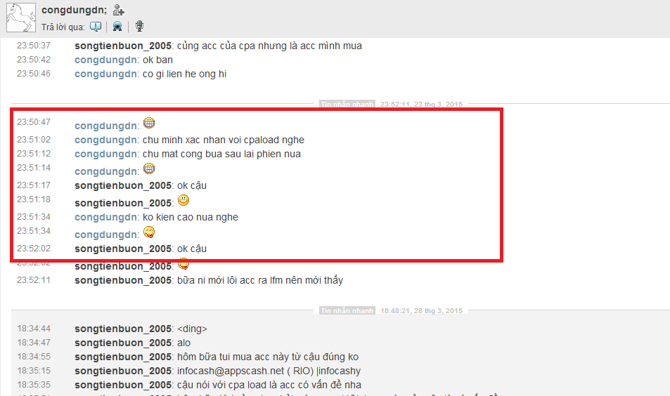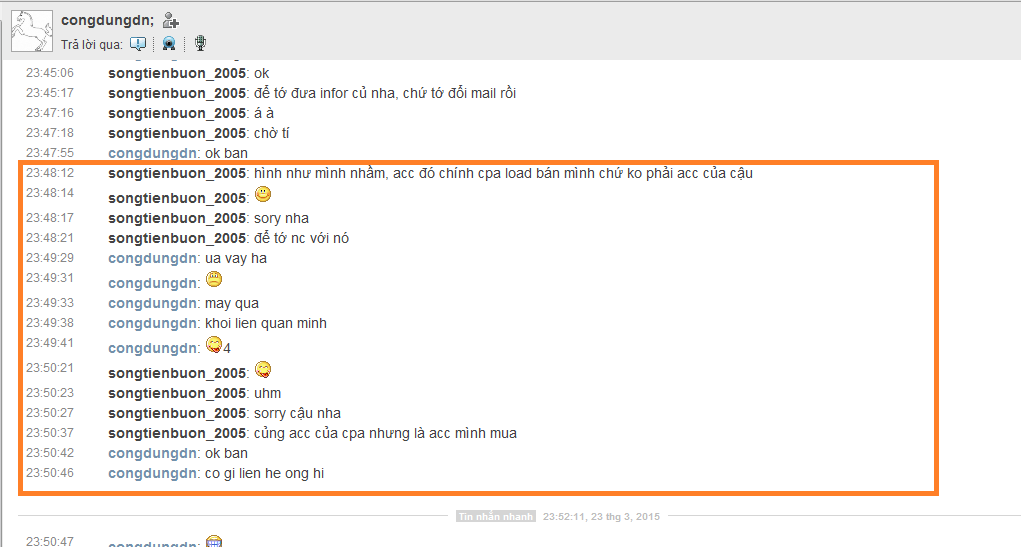 thứ 2: ngày 23-3: khi mình nhầm acc mình mua của cậu với acc mua của congdungdn, mình đã vào giải quyết với cậu và cậu đưa ra 2 hướng giải quyết