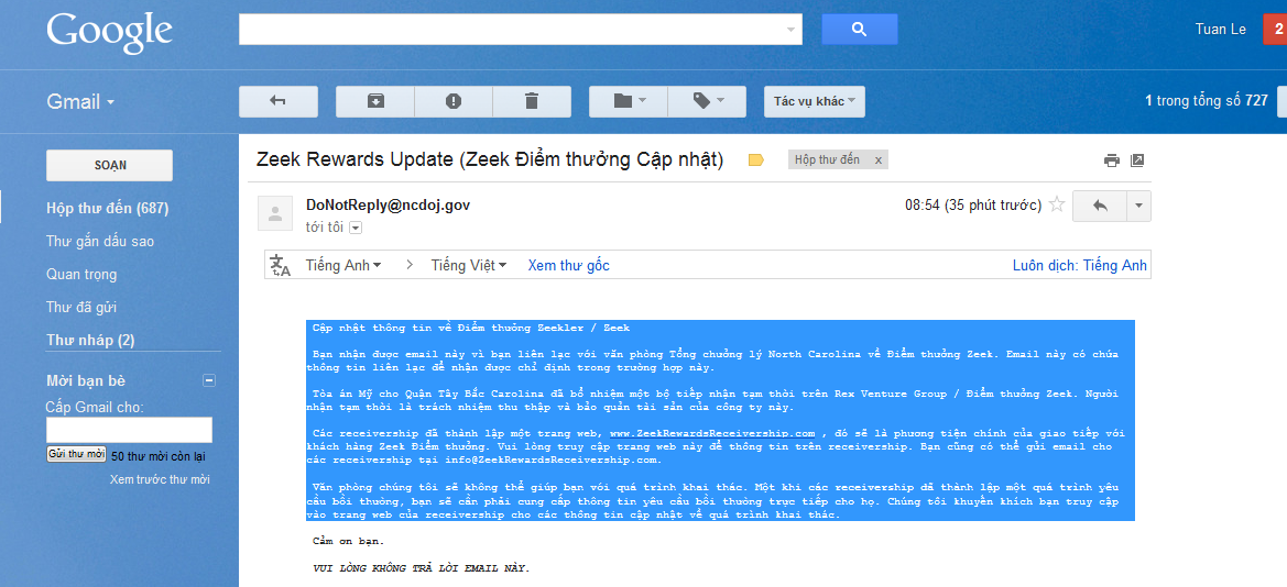 Vừa nhận được email từ văn phòng Tổng chưởng lý NC về zeek