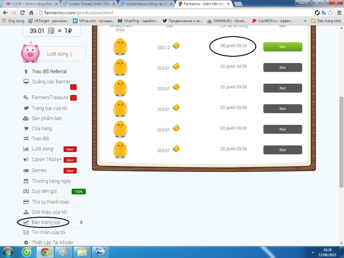 Các bác đeer ý có phần "Bán nông trại" đấy, 5 con gà được tặng thì ko bán được, nhưng nếu các bác mua được con gà nào thì nó sống được 100 ngày, đến ngày cuối cùng của nó các bác bán nó đi nhé, như thế thì may ra còn một ít lãi ạ...hehe...