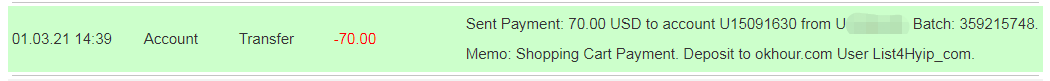 Details: Received Payment 27.87 USD from account U15091630. Memo: API Payment. Withdraw to NewHyipsInfo from okhour.com.