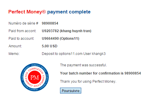 The amount of 1.5 USD has been deposited to your Perfect Money account. Accounts: U9664490->U9124166. Memo: API Payment. Withdraw to kieucaocao from options11.com.. Date: 08:51 21.08.15. Batch: 98902243.