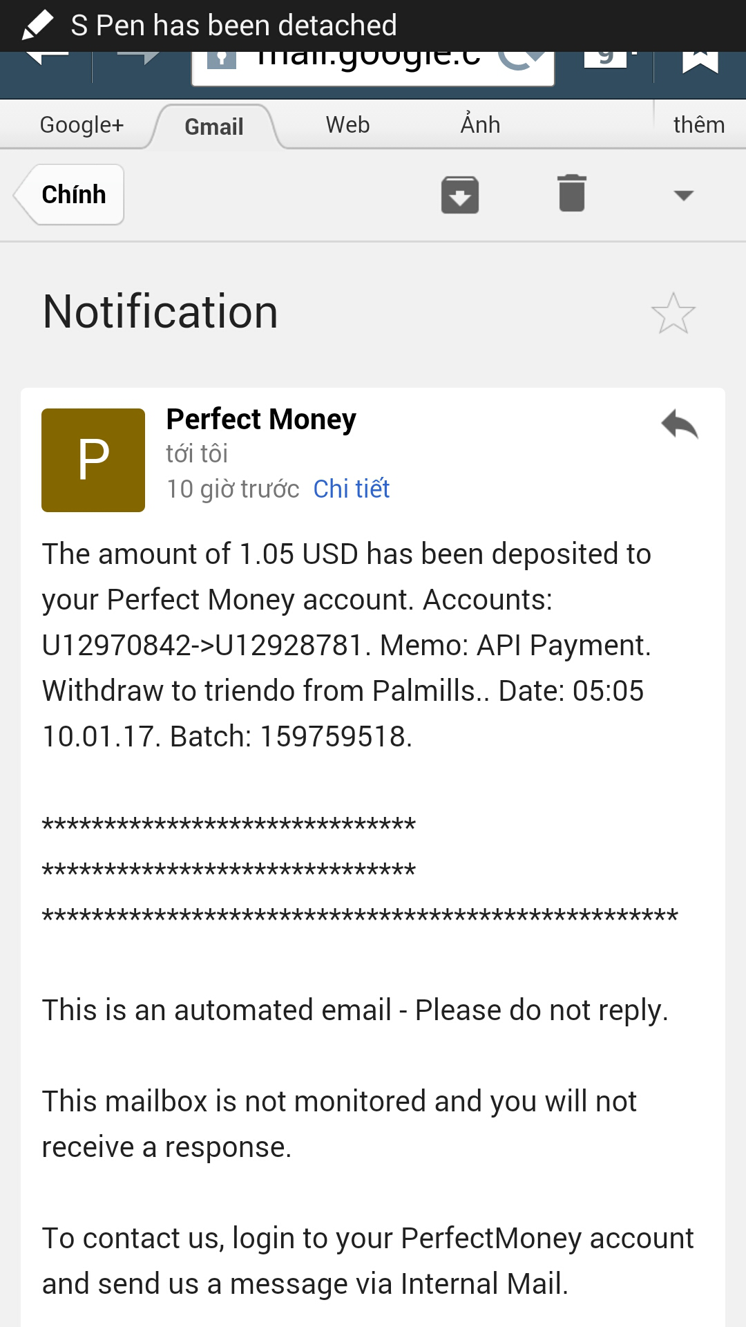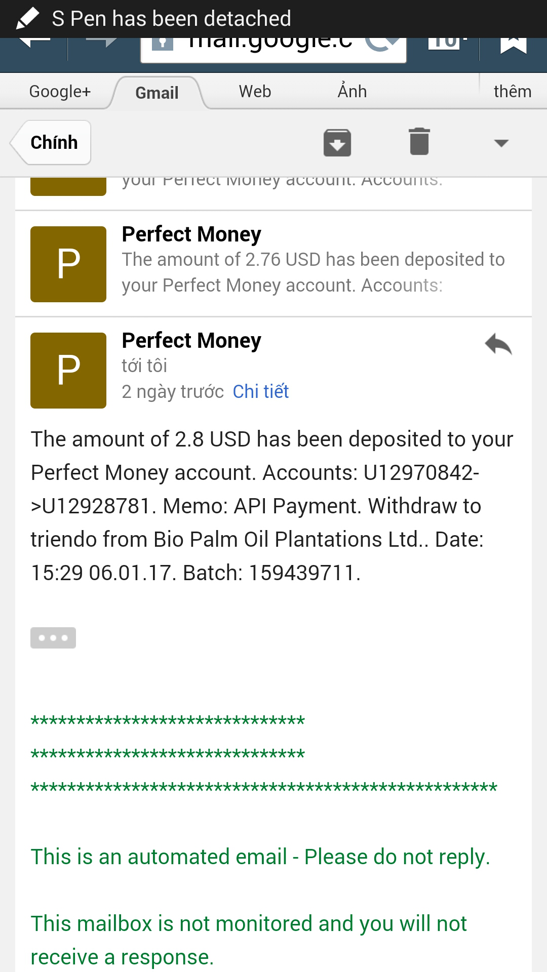 The amount of 2.8 USD has been deposited to your Perfect Money account. Accounts: U12970842->U12928781. Memo: API Payment. Withdraw to triendo from Palmills.. Date: 14:39 13.01.17. Batch: 160136138.