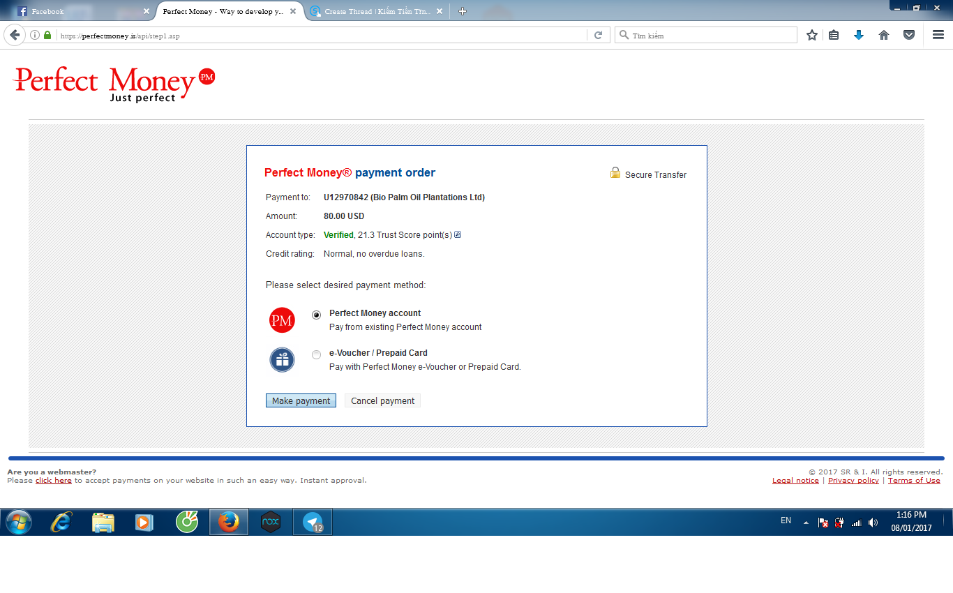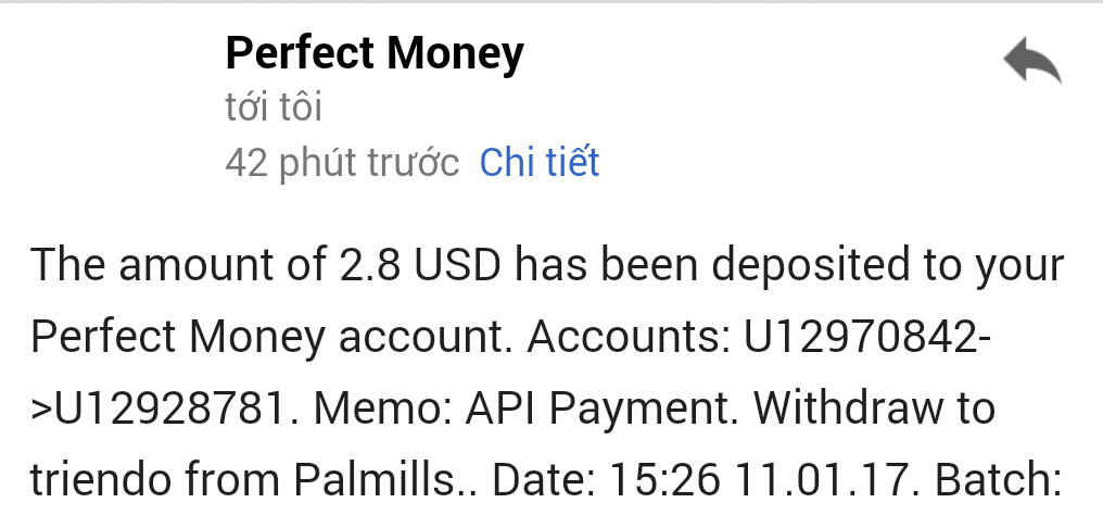 The amount of 2.8 USD has been deposited to your Perfect Money account. Accounts: U12970842->U12928781. Memo: API Payment. Withdraw to triendo from Palmills.. Date: 14:28 20.01.17. Batch: