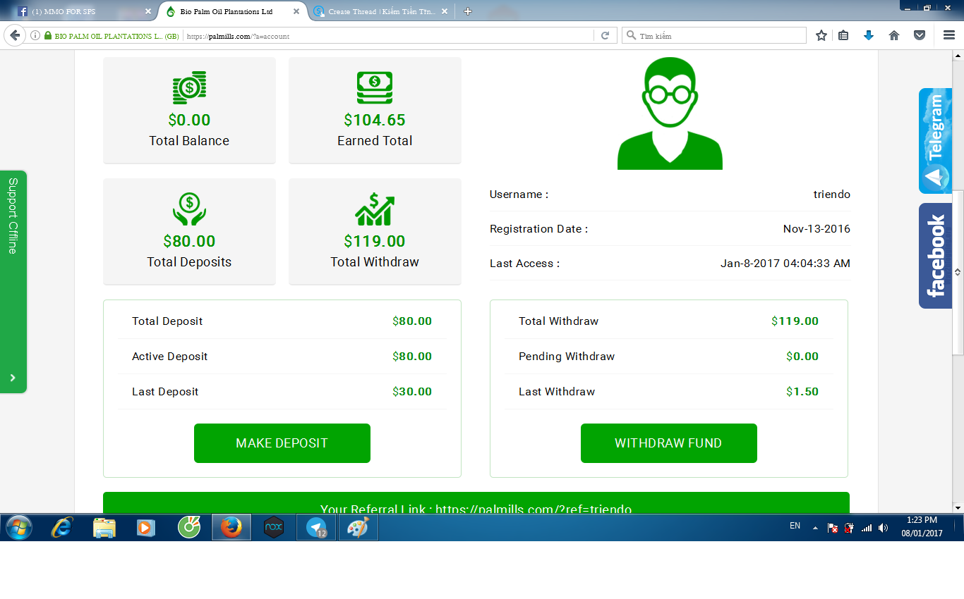 Quá trình đầu tư đến đây hoàn thành, nhiệm vụ của bạn là hằng ngày vào BioPalmOil [Palmills] để rút lãi về ví tiền của bạn.