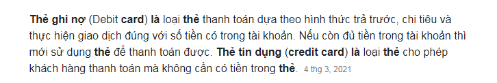 Debit card là thẻ thanh toán, còn credit card là thẻ ghi nợ :popo_big_smile: