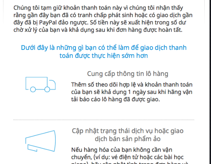 Vấn đề là 1 số tt thì lại ok, còn đa phần là bị hold. Mình vô tài khoản PP mục resolution center thì ko có cái case nào đang mở cả ..