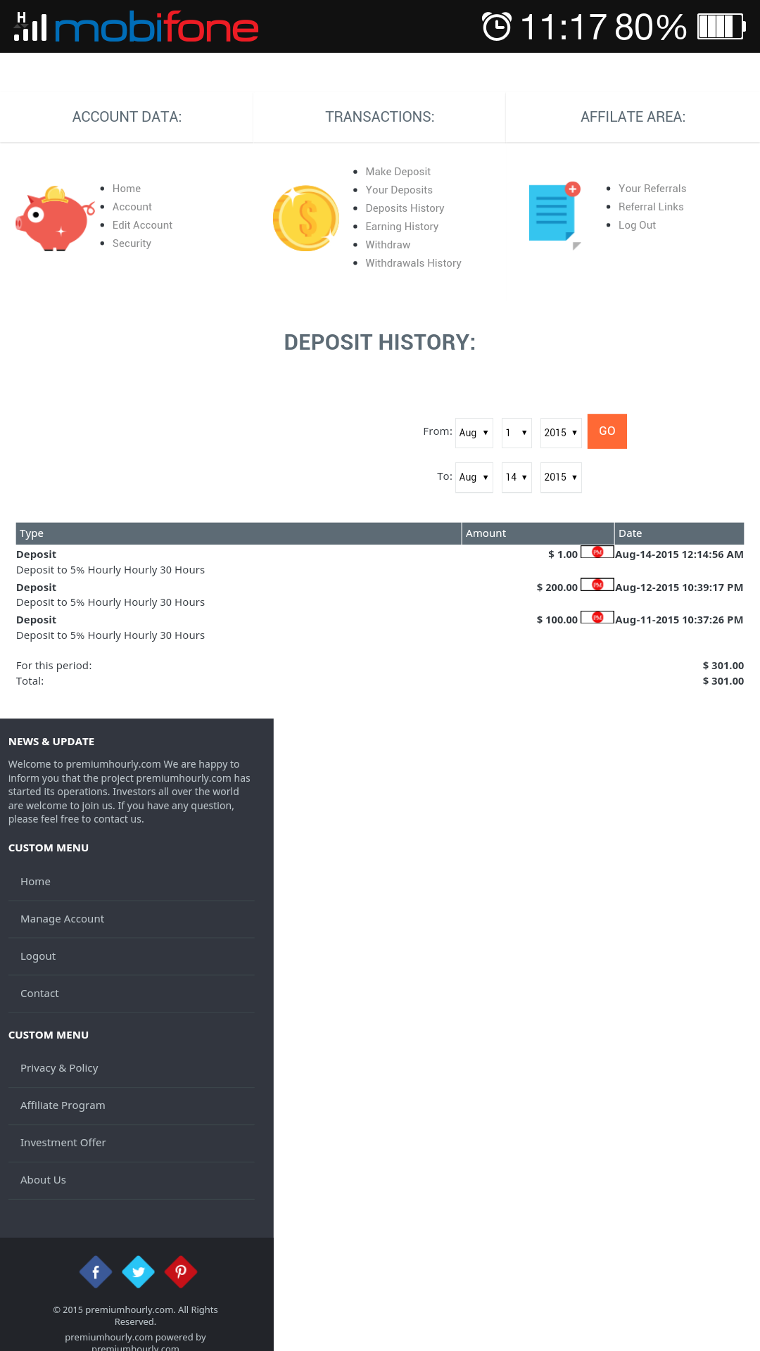 The amount of 1.18 USD has been deposited to your Perfect Money account. Accounts: U9021683->U1896276. Memo: API Payment. Withdraw to hyipdollar from premiumhourly.com.. Date: 17:11 12.08.15. Batch: 97868918.