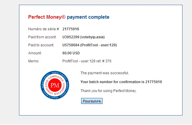 Date: 5/4/2013 5:59 AM Batch: 142594450 From Account: U0359411 (ProfitTool.Net) Amount: $3.00 Memo: Withdrawal of funds Thank you.