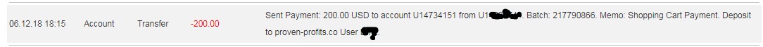 Received Payment 204.00 USD from account U14734151 to account U******. Batch: 217890973. Memo: Shopping Cart Payment. Withdraw to ***** from proven-profits.co.