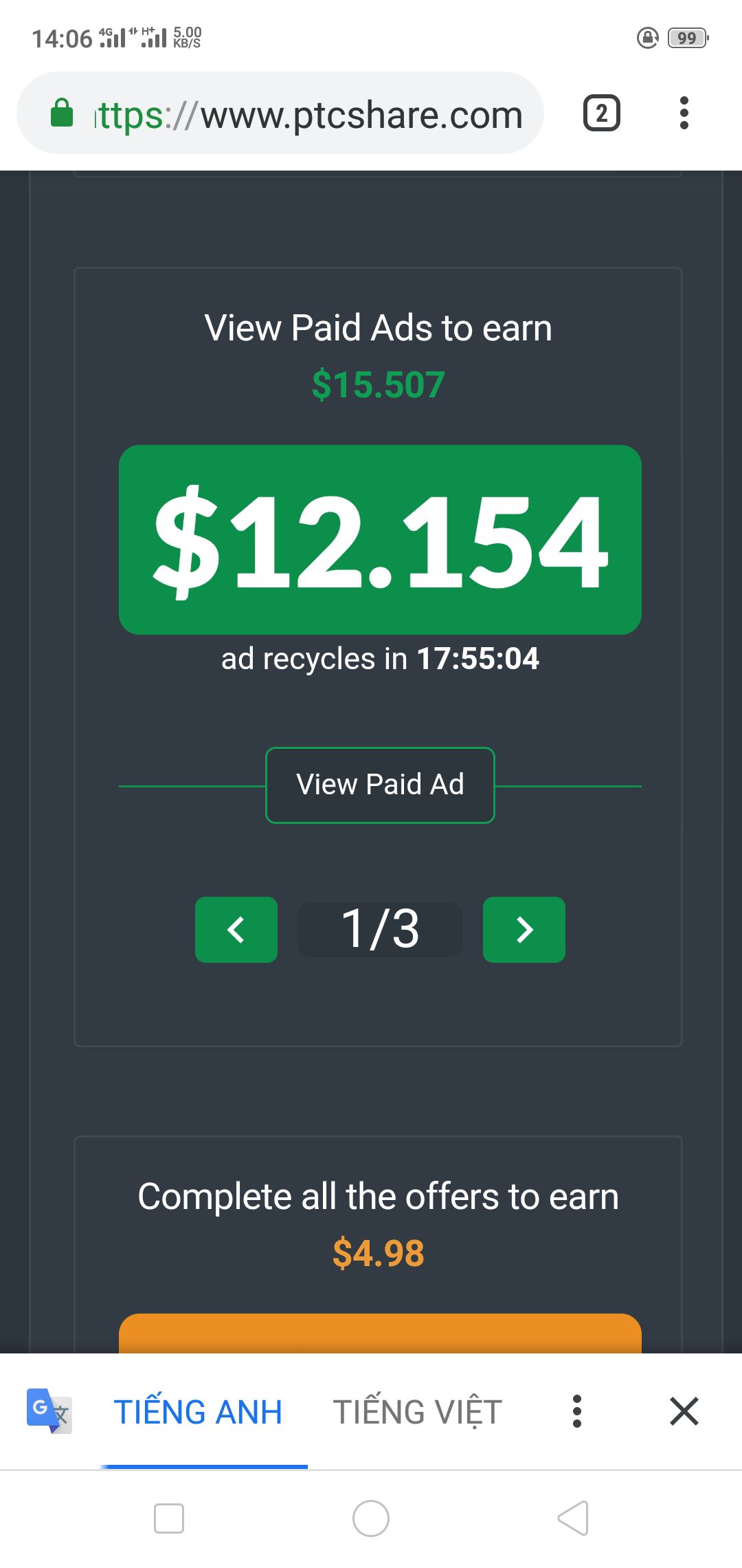 không biết các bạn sắp giàu chưa , chứ mình đã nạp , chơi và cảm thấy thất vọng sau 3 ngày đầu tiền , nói thẳng ra là đã bị đánh lừa bởi những con số , vip 7 - nhóm 10% thành tựu mà cả ngày đêm ra được 3$ giá trị ad , với thời gian công sức như thế có 3$ tiền tươi còn chưa thỏa đáng , huống chi 3$ bẻ làm 5 , thôi thế là đủ biết mùi vị cái ptc đình đám này luôn rồi , kể cả muốn dừng ngay lập tức cũng phải mấy tháng trời nữa mới mong thu hồi vốn với cái tài khoản về con số 0