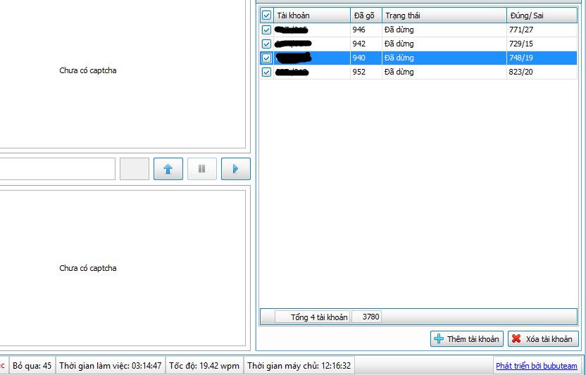 Captcha mà dự án nào cũng an gian chỉ ít nhiều vì nó toàn tự động nên tương đối hếtChiều nay để nguyên tool làm việc thì mới phát hiện ra điều này, cứ nghĩ là sever chưa cập nhật số code gõ được nhưng mình thử đợi 1 2 tiếng sau login vào web vẫn thấy số code như trong hình. Các bác giải thích giúp mình, tại sao mình gõ id nào cũng hơn 900 code nhưng cộng cả code đúng và sai lại của từng id thì chưa tới 800codes, mình bỏ qua tất cả 40code/3xxx code.