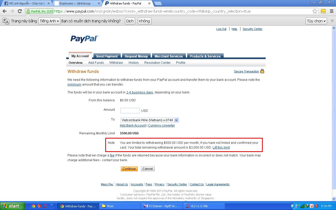 p.s : đính kèm ảnh buồn cười quá). Mình trích câu đấy vậy : You are limited to withdrawing $500.00 per month, if you have not linked and confirmed your card. Các bạn giải đáp giúp mình với