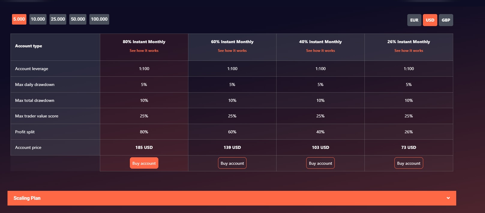 giới hạn sụt giảm tài khoản ngày là 5%, giới hạn sụt giảm tài khoản tối đa 10%, nhận thanh toán sau 28 ngày từ khi nhận tài khoản, được chia 40% trên tổng lợi nhuận đạt được