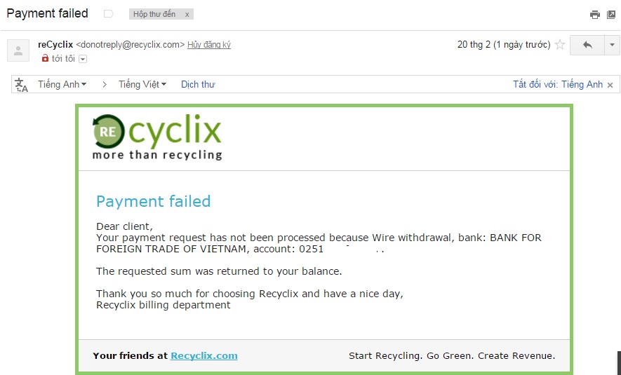 Your payment request has not been processed because Wire withdrawal, bank: BANK FOR FOREIGN TRADE OF VIETNAM, account: 0251142743927.