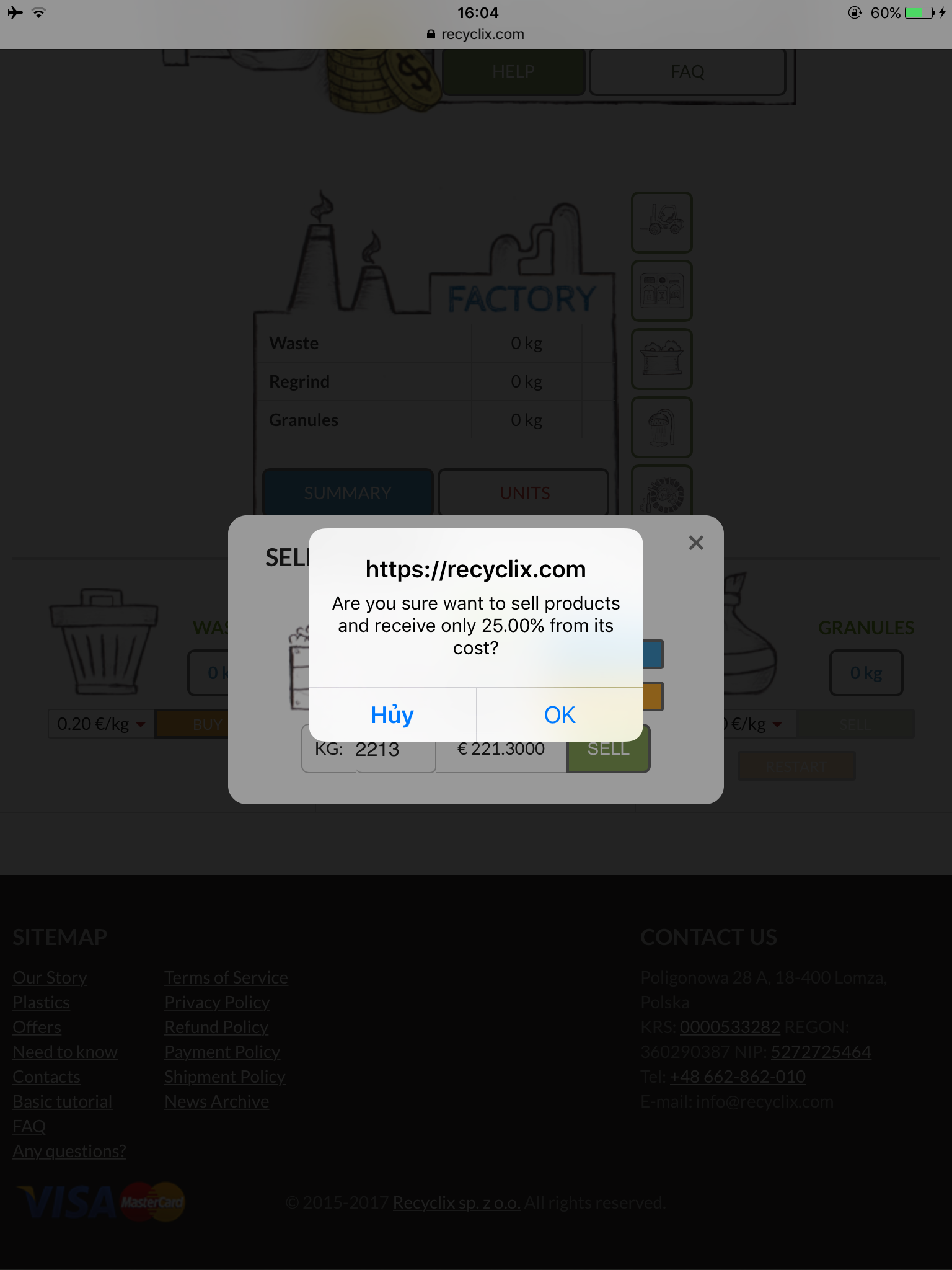 ý mình là nó bắt mình xác minh tài khoản, đã 2 tháng không trả lời trả vốn gì, không nói là có xác minh được hay ko... giờ mình đang lo là nó ko cho xác minh mà cũng chẳng hiện nút Sell khi hết chu kỳ như bác nói... hoang mang quáNó sẽ hiện cái bảng thông báo như bên trên rồi thì chi còn cách bán rác. Với hiện tại chưa có thành phẩm ở đấy thì nút sell chưa hiện đâu. Nếu nó vẫn còn là 0 kg thì nút sell chưa hiện.