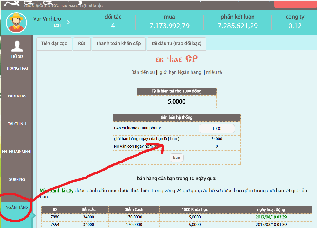 >>>Chú ý đối với các bạn chơi đầu tư là không nạp tiền không nên rút luôn mà hãy lấy cái tiền đó đổi điểm giới hạn ở cái hình ngân hàng để ngày nào cũng có 1 số tiền cố định có thể rút được nhé