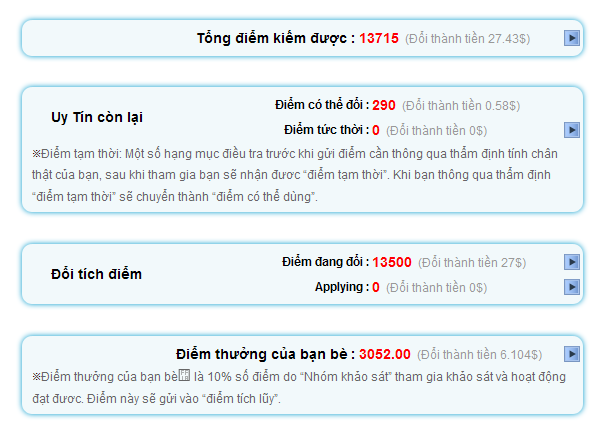 2. Đợi hệ thống xác nhận : sau khi hoàn tất quá trình khảo sát, bạn sẽ nhận được một số điểm thưởng tạm thời. Chỉ khi nào hệ thống xác nhận việc khảo sát của bạn là hợp lệ, điểm thưởng này mới được chuyển sang trạng thái có thể rút.