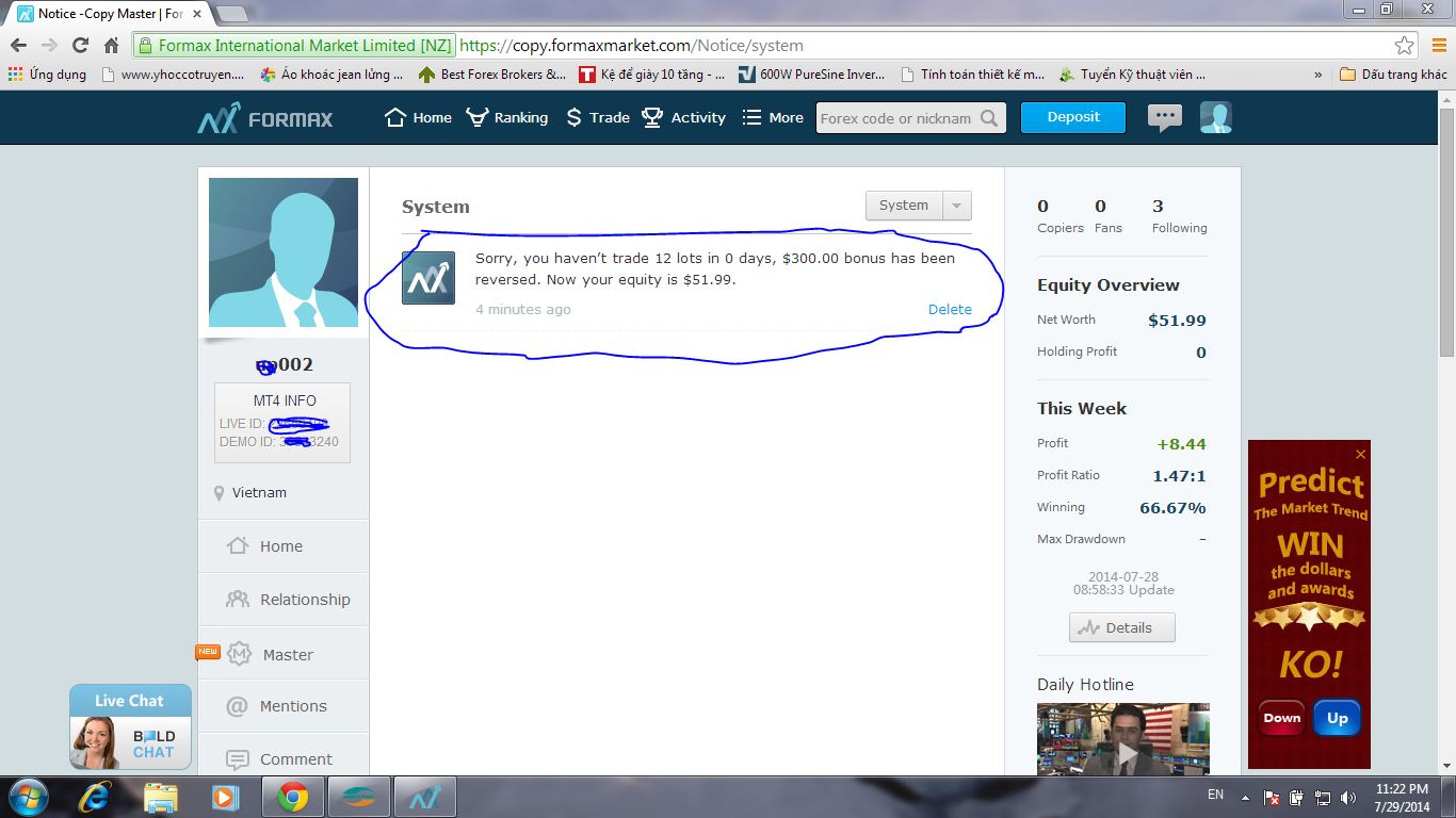 Các bạn ko biết là ngay cả bonus nạp tiền thật như FBS mà nó còn soi IP nữa là tk free 100$.