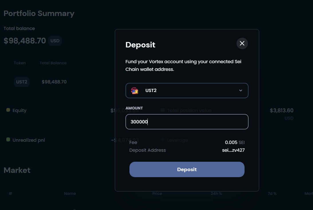 Bây giờ truy cập vào Vortex Protocol. Và kết nối với ví keplr của bạn tiến hành nạp deposit vào vortex, chúng ta sẽ nạp ust2 vào