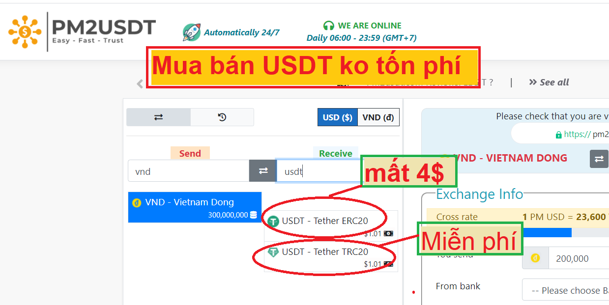 • Min mua bán USDT TRC20: 200,000 VND / 10$, miễn phí chuyển