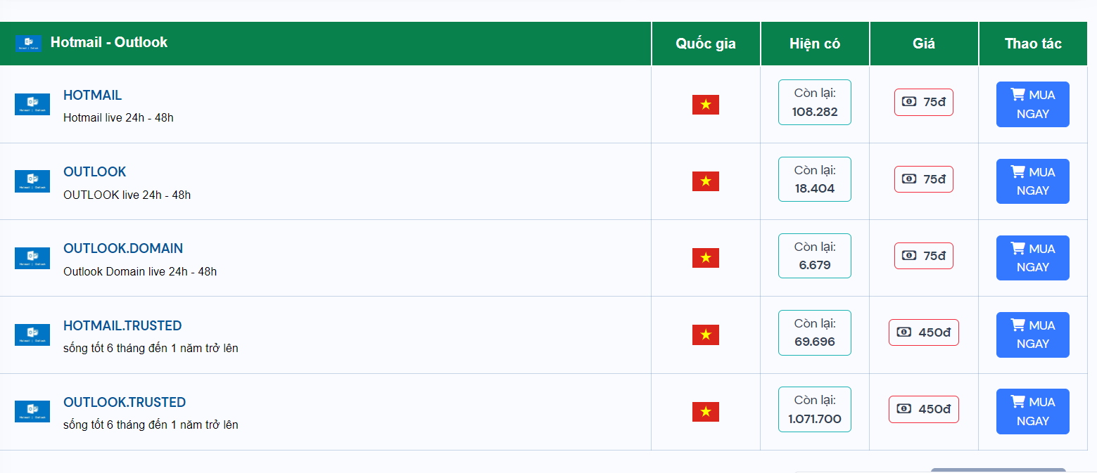 HOTMAIL, OUTLOOK : 75đ - 450đ