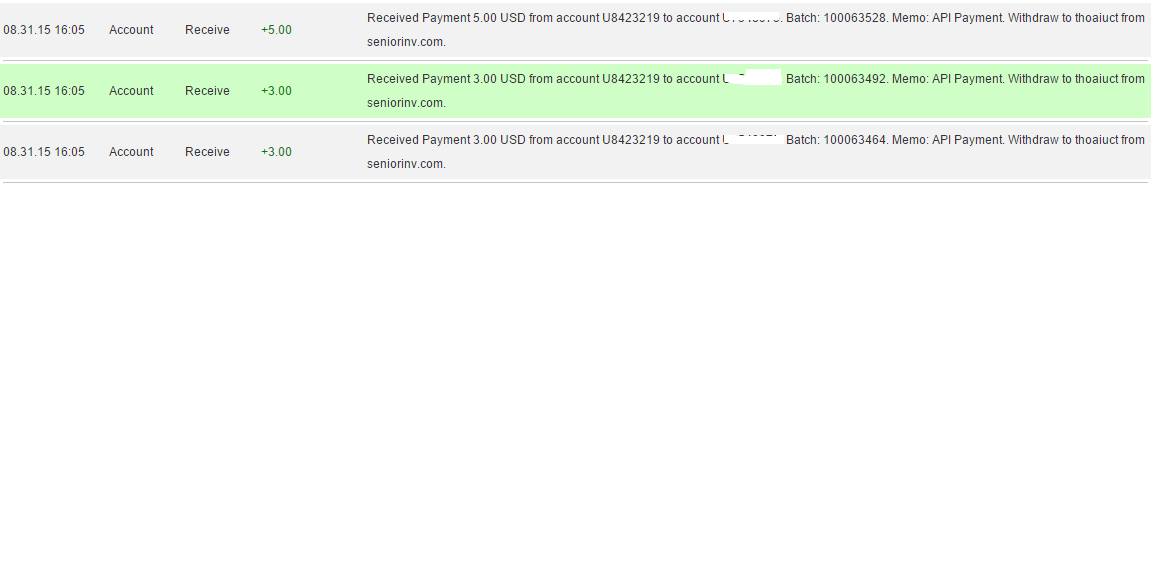 31.08.15 16:09 Receive Received Payment 3.00 USD from account U8423219 to account U7920035. Batch: 100064045. Memo: API Payment. Withdraw to newptc365 from seniorinv.com.