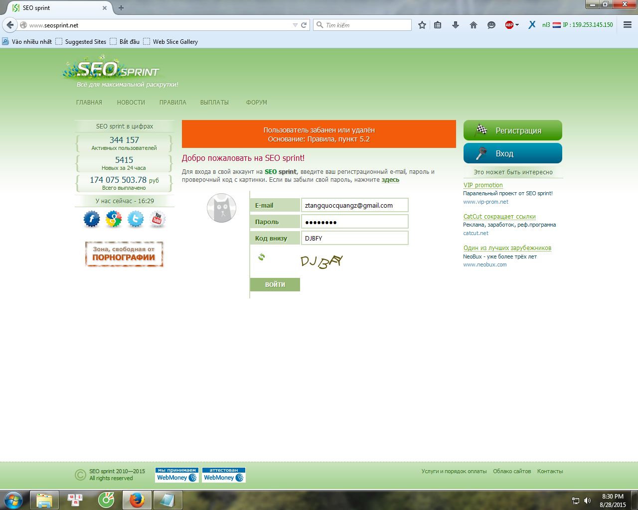 tình hình là lâu k vào giờ vào thì k được nên fake ip = tiện ích của firefox vào thì được nhưng đăng nhập thì báo là thế nầy ??