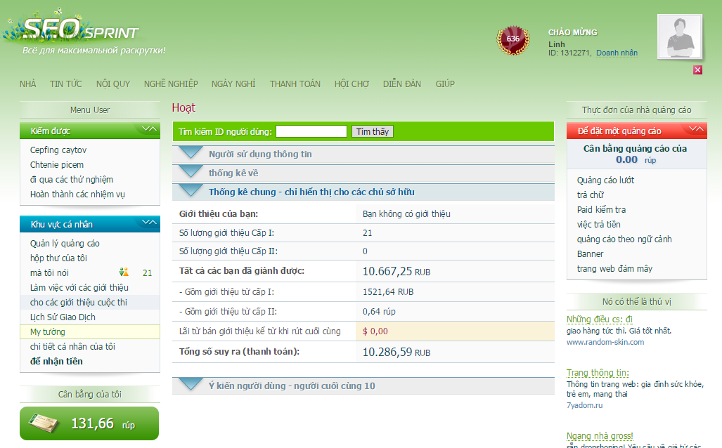 - Giá click ở SS giao động từ 0.05-0.07 Rub ( nếu làm ref của mình, giá click của bạn sẽ từ 0.07-0.09) vì bạn được tự động cộng 80% tiền reback của mình. ( cái này hoàn toàn tự động của hệ thống, mình set reback cho tất cả ref của mình là 80% – đây là giá trị reback tự động cao nhất tại SS).
