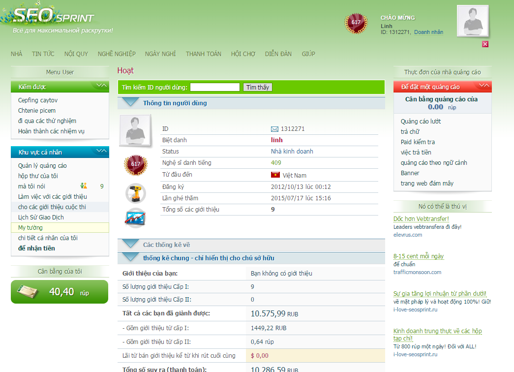 - Giá click ở SS giao động từ 0.05-0.07 Rub ( nếu làm ref của mình, giá click của bạn sẽ từ 0.07-0.09) vì bạn được tự động cộng 80% tiền reback của mình. ( cái này hoàn toàn tự động của hệ thống, mình set reback cho tất cả ref của mình là 80% – đây là giá trị reback tự động cao nhất tại SS).