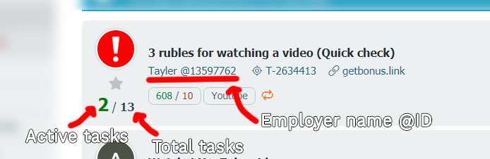 JavaScript:(function() { 'use strict'; const init = {} for (const adv of document.querySelectorAll('.adv-line')) { // Lấy ID employer const employerId = adv.querySelector('a.ref-block-av').href.match(/\d+/g)[0] const employerClass = `employer-${employerId}-tasks` // Thêm element hiển thị thông tin tasks của employer const template = document.createElement('template') template.innerHTML = `<span style="white-space: nowrap" translate="no" class="${employerClass}"> <b class="active-tasks" title="Active tasks" style="color: green; font-size: 1.25rem"></b> <span>/</span> <b class="total-tasks" title="Total tasks"></b> </span>` adv.querySelector('.adv-line-cell-1').append(template.content.firstChild) // Thêm element hiển thị thông tin member của employer template.innerHTML = `<span style="margin-right: 14px" translate="no" class="${employerClass}"> <span class="member-info"></span> </span>` adv.querySelector('.advmoder > div > span:first-child').prepend(template.content.firstChild) if (!init[employerId]) { // Chỉ chạy task getEmployerCached nếu employerId chưa khởi tạo (chỉ chạy 1 lần duy nhất) getEmployerCached(employerId).then(employerData => { // Update thông tin trong web bằng dữ liệu lấy được for (const elem of document.querySelectorAll(`.${employerClass} .active-tasks`)) { elem.innerHTML = employerData.active_tasks } for (const elem of document.querySelectorAll(`.${employerClass} .total-tasks`)) { elem.innerHTML = employerData.total_tasks } for (const elem of document.querySelectorAll(`.${employerClass} .member-info`)) { elem.innerHTML = `${employerData.name} ${employerData.id}` } }) init[employerId] = true } } })();