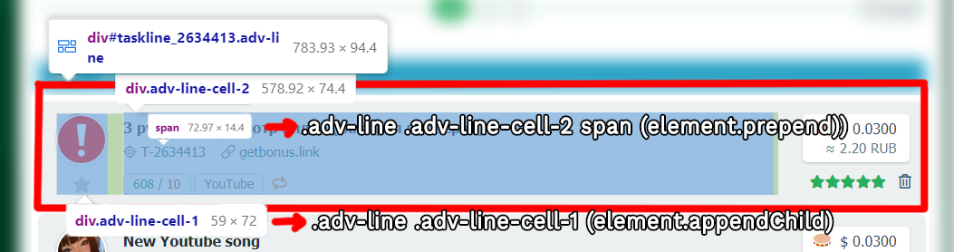 HTML:<div class="adv-line"> <div class="adv-line-cell-1">...</div> <!-- Đây là nơi ta dùng appendChild để thêm thông tin tasks --> <div class="adv-line-cell-2"> <span title="Site ID">...</span> <!-- Và dùng prepend vào <span> này để thêm thông tin employer --> ... </div> </div>
