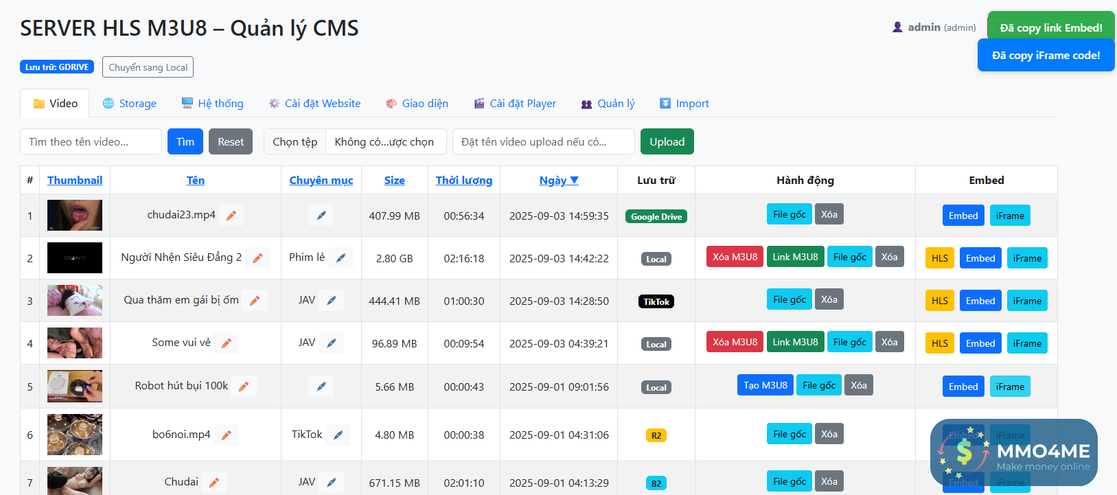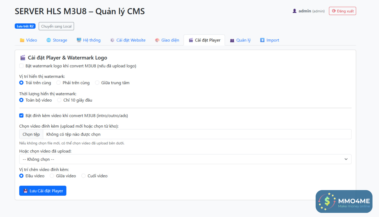 Tự load các file video có sẵn storage vps, ftp,cloud hoặc file upload thông qua vps tự đưa vào panel admin tạo link hls hoặc lấy link gốc.
