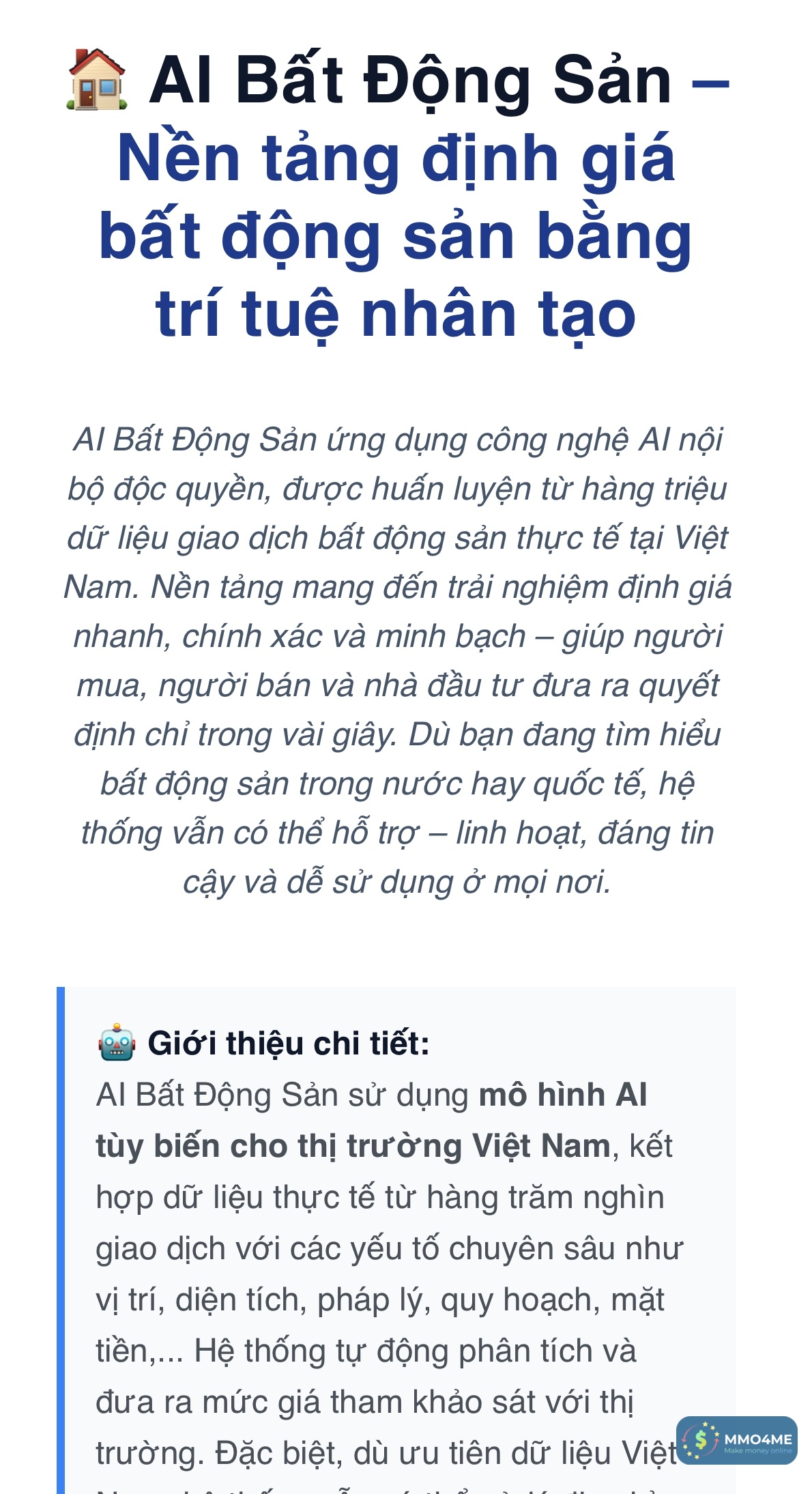 Không cần đăng tin rao vặt, không phải hỏi môi giới – chỉ cần gõ địa chỉ nhà là AI sẽ trả lại giá ước lượng sát thị trường + phân tích yếu tố xung quanh.