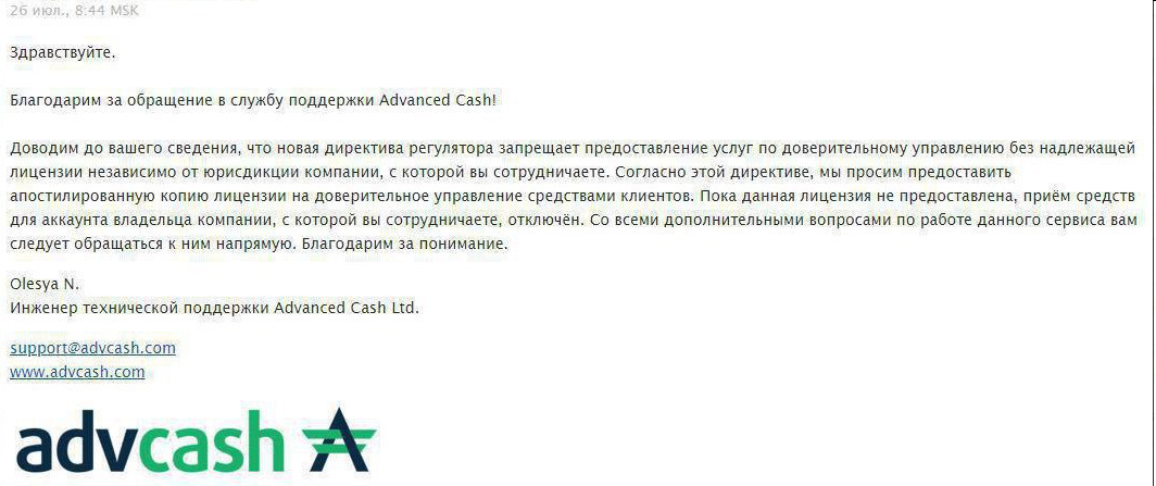 GG dịch: Xin chào. Cảm ơn bạn đã liên hệ với nhóm hỗ trợ Tiền mặt Nâng cao để thông báo cho bạn rằng chỉ thị mới cấm cung cấp dịch vụ quản lý tin cậy mà không có giấy phép phù hợp, bất kể thẩm quyền của công ty bạn đang làm việc. Theo chỉ thị này, chúng tôi yêu cầu bạn cung cấp một bản sao được apostilled giấy phép quản lý lòng tin của khách hàng. Trong khi báo giá này không được cung cấp, việc nhận tiền cho tài khoản của chủ sở hữu công ty mà bạn đang hợp tác bị vô hiệu hóa. Với bảy câu hỏi bổ sung về hoạt động của dịch vụ này, bạn nên liên hệ trực tiếp với họ. Cảm ơn sự thông cảm của bạn Olesya N Technical Support Engineer Advanced Cash Ltd. advcash A