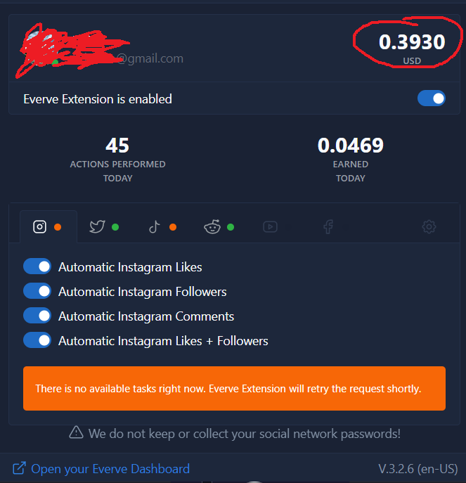 Extension này sẽ liên kết các tài khoản MXH của bạn (tiktok, instagram, twitter, reddit) và làm nhiệm vụ auto like, sub, follow, cmt để kiếm tiền. Mình treo một ngày được 0.4$. Tuy không quá nhiều nhưng khá là nhàn
